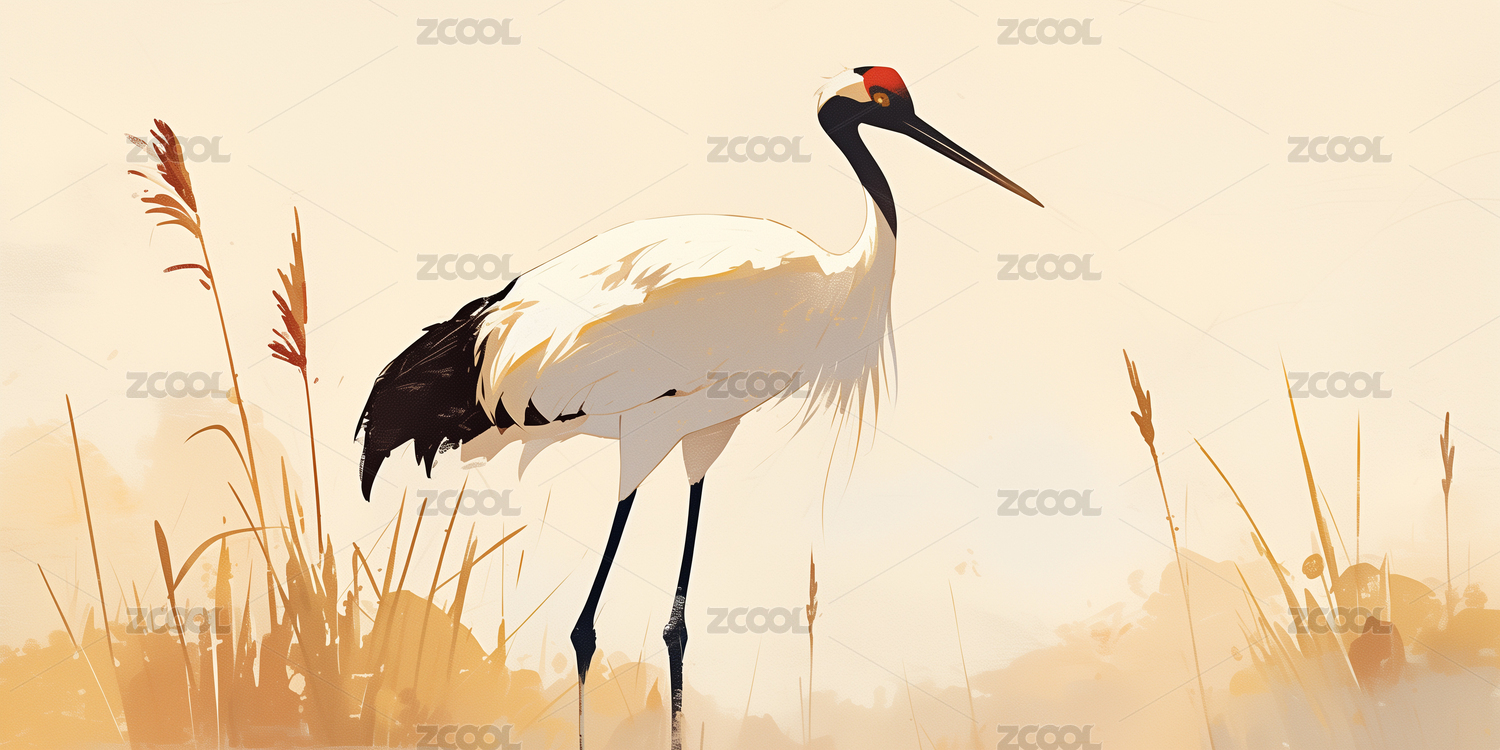 水墨风芦苇丛中的仙鹤插画