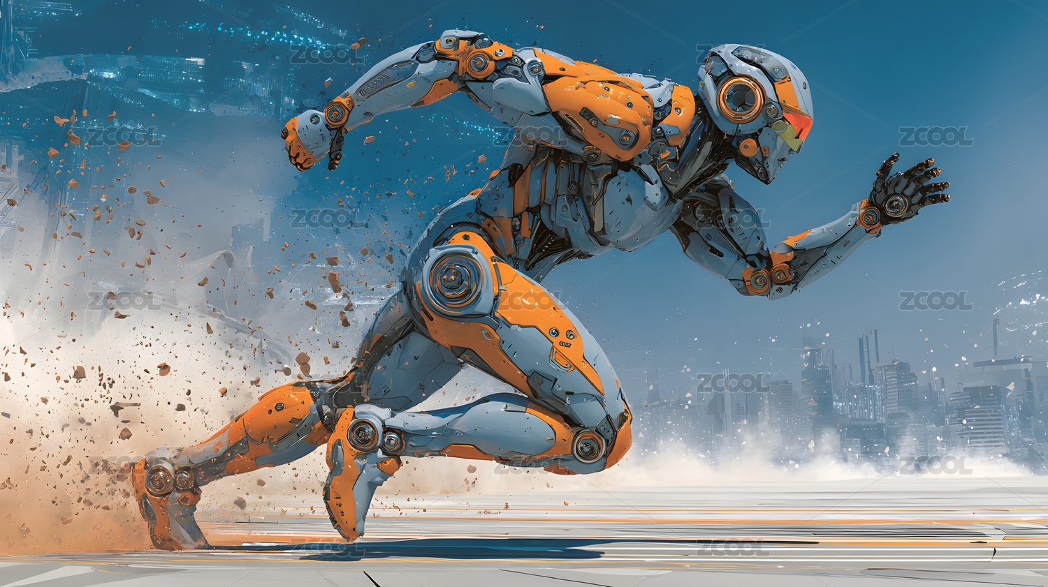 未来战士疾跑城市尘埃,动态科幻