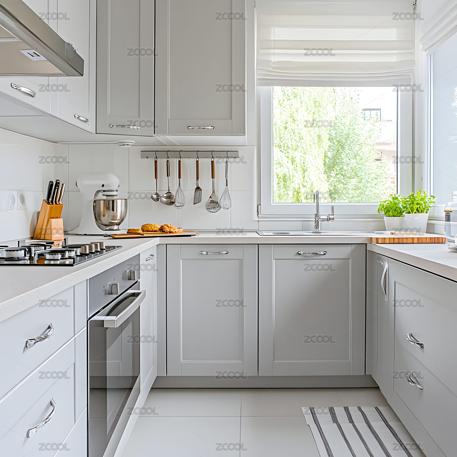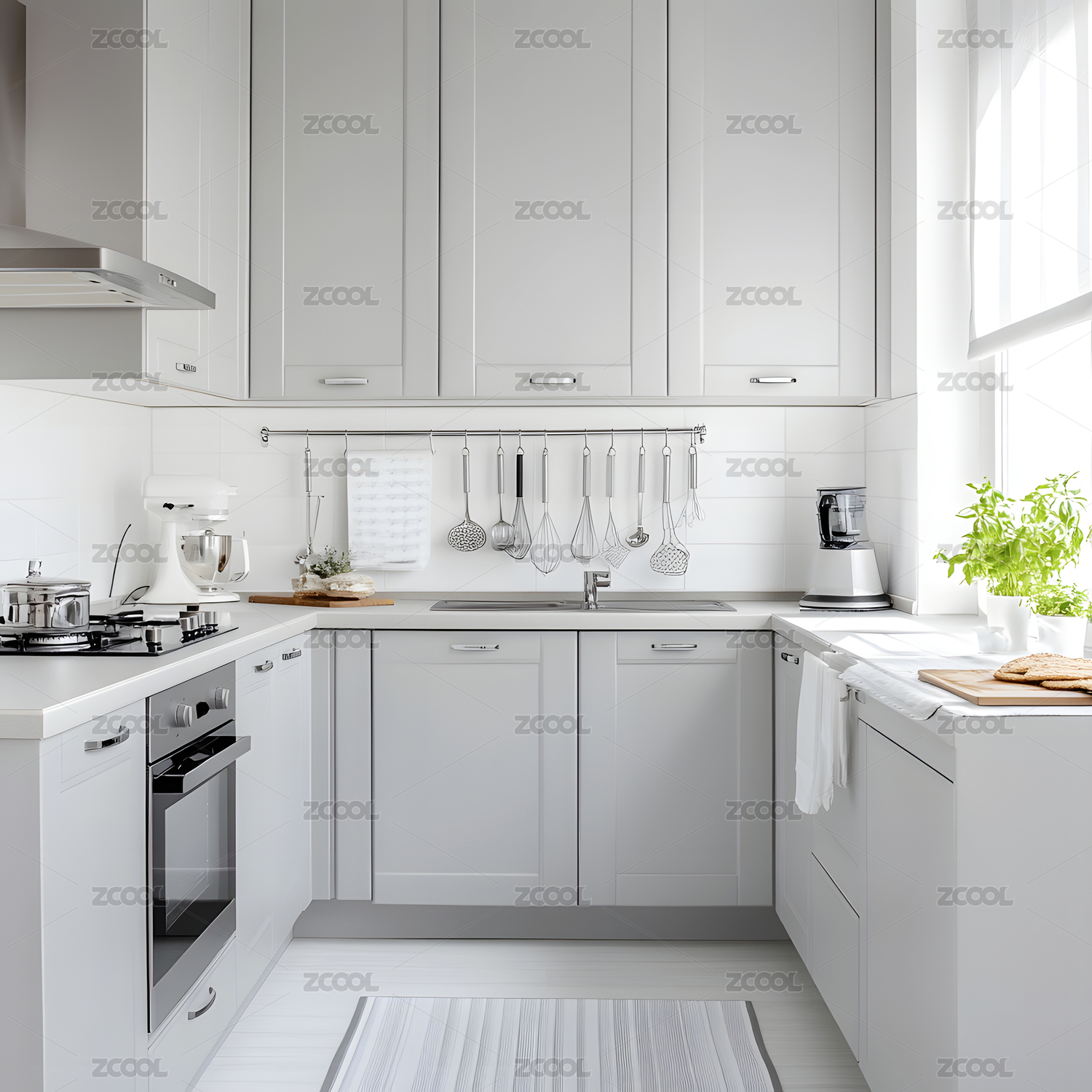 设计,简约,厨房,现代,白色,灰色,橱柜,烹饪,器皿,锅