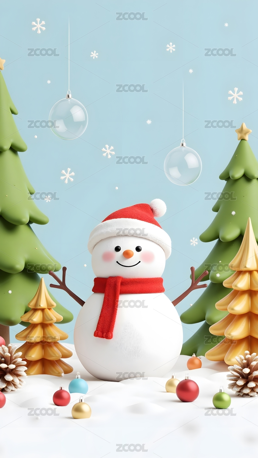 3d渲染的圣诞节卡通圣诞树雪人和礼物插画