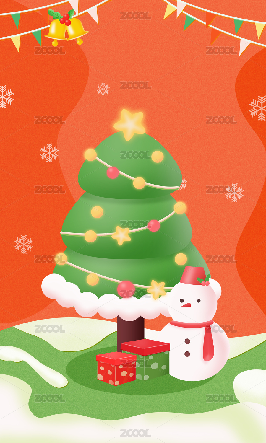 一颗圣诞树前有开心的雪人和很多礼盒插画