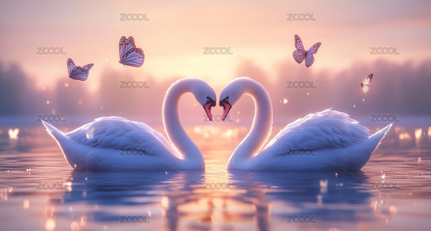 夕阳中两只天鹅组成的爱心图形唯美插画