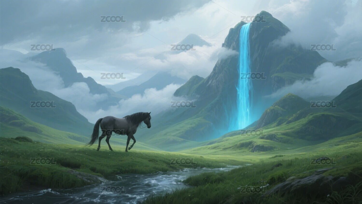 骏马,瀑布,草原,河流,自然景观,插画,风景,奇幻,矢量,梦幻