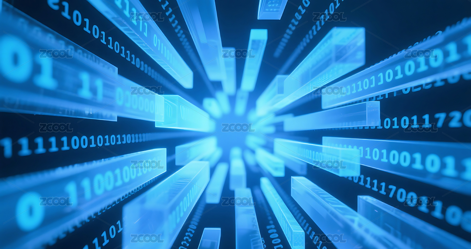 蓝绿色立体玻璃条块和代码向四周扩散背景