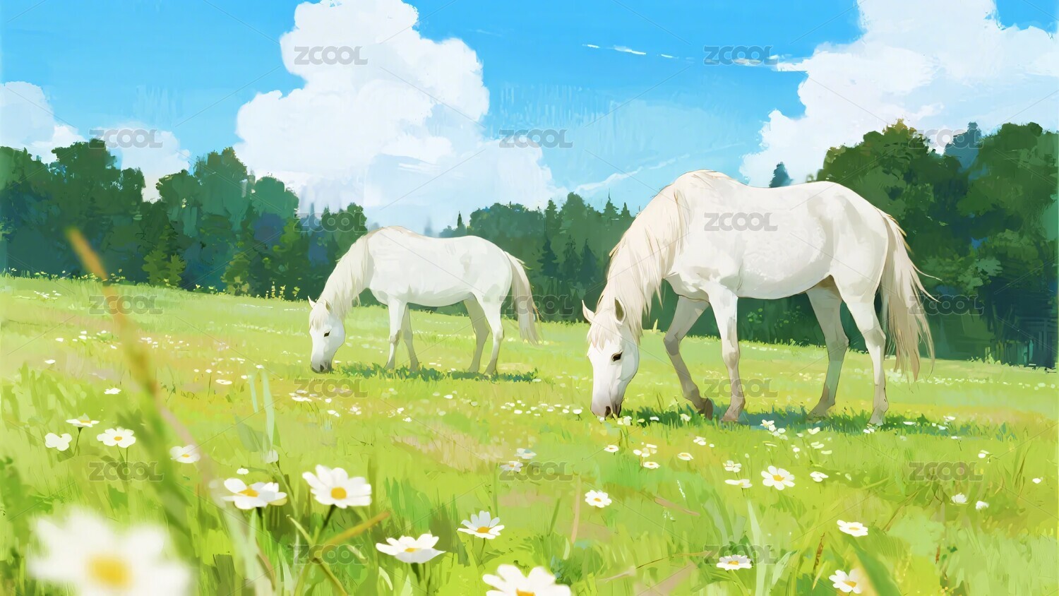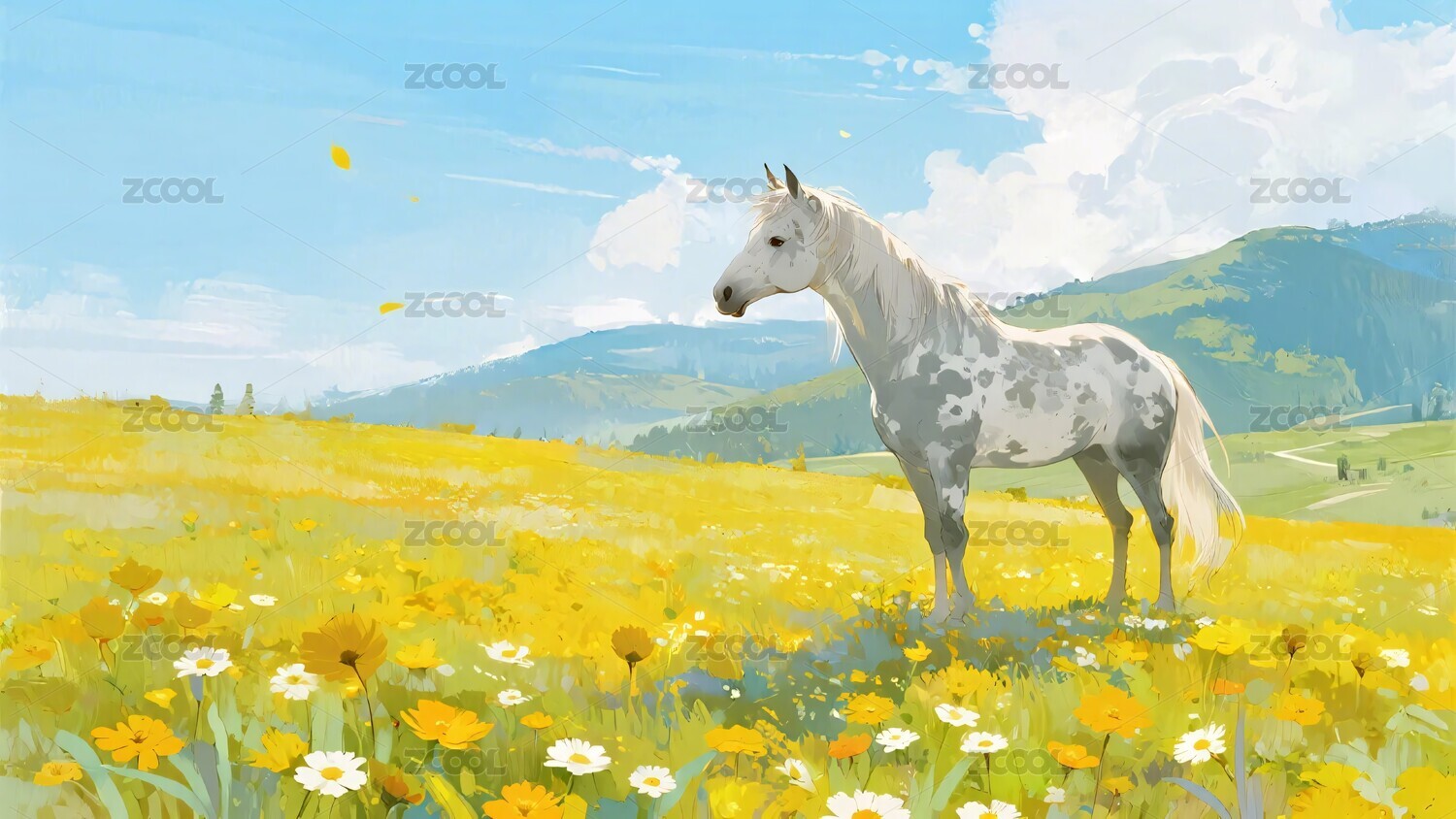 白马,草原,花海,蓝天,白云,插画,风景,自然,画面元素,主题
