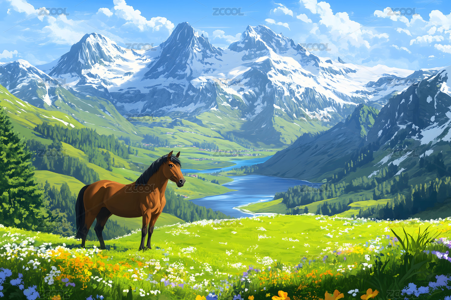 阿尔卑斯山脉上的骏马