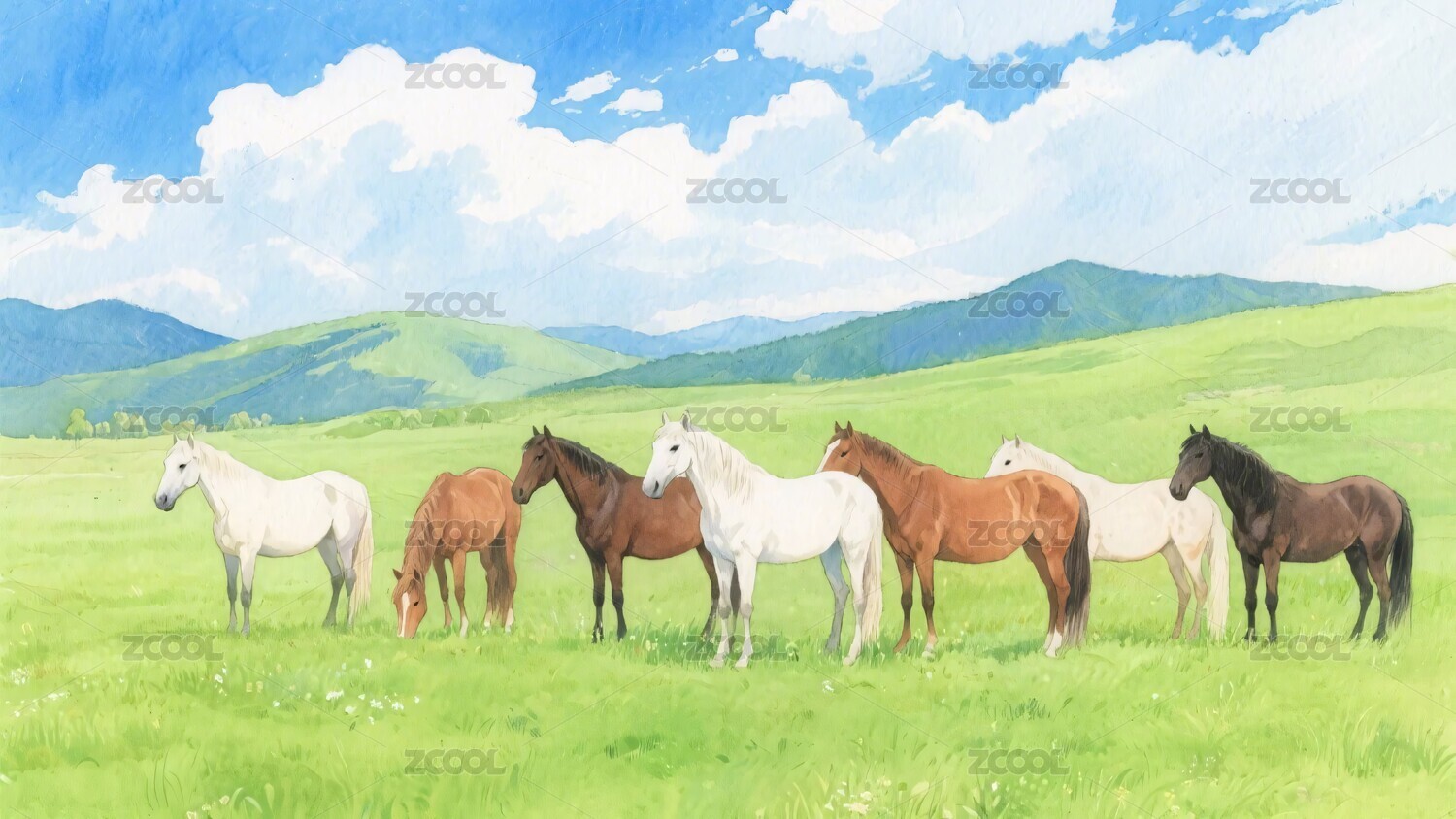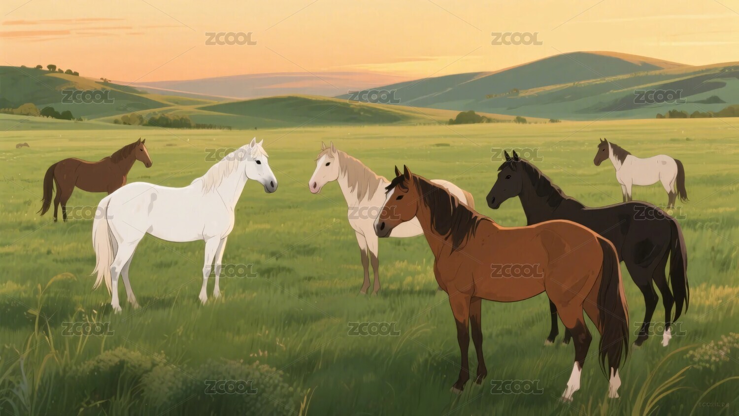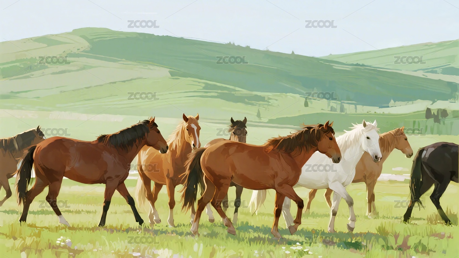草原,自然,风景,绘画,动物,群像,原野,绿色,草地,马匹
