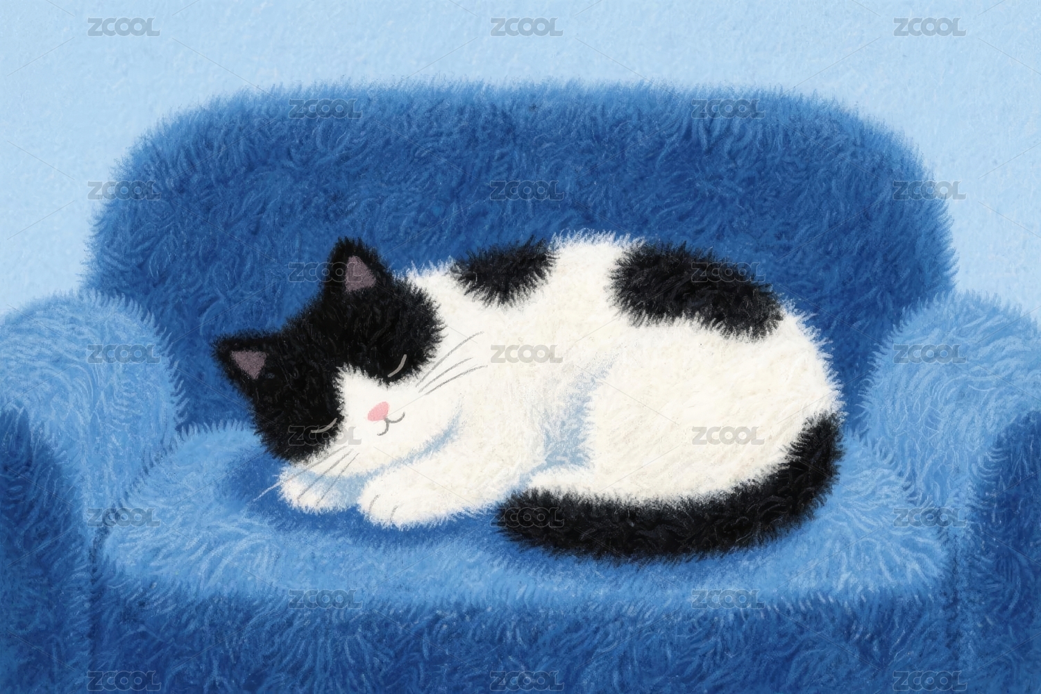 猫,蓝沙发,毛绒沙发,黑白猫,宠物,动物,可爱动物,插画,绘画,可爱