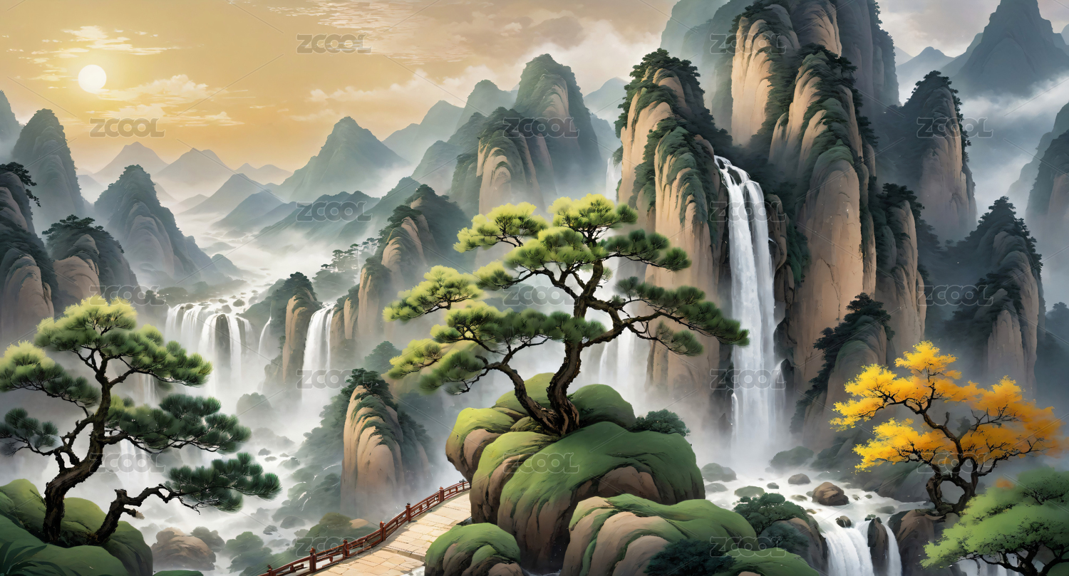 山峰,云雾,树木,风景,意境,瀑布,水墨,山水,古典,夕阳