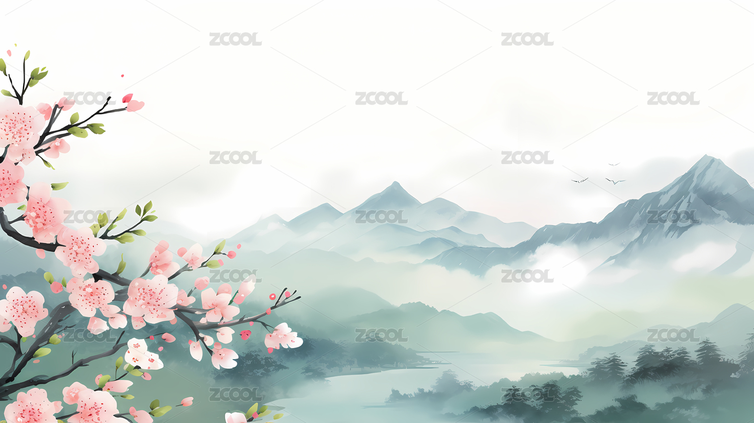 水彩淡雅山谷櫻花圖