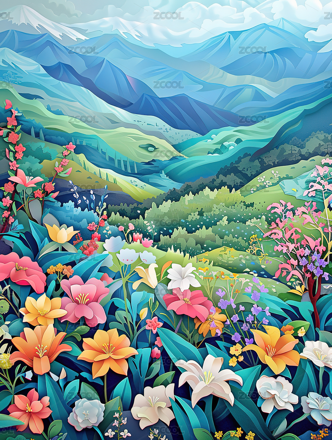 多维剪纸风格春天山谷里盛开的花海插画