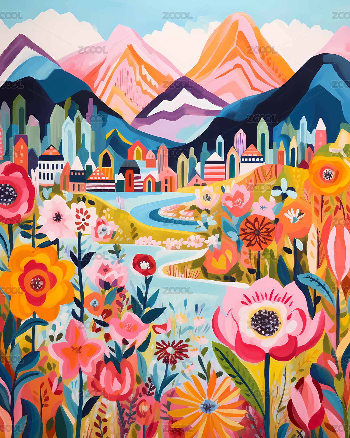 设计,花卉,艺术,山脉,自然,山谷,宁静,美丽,风景,插画