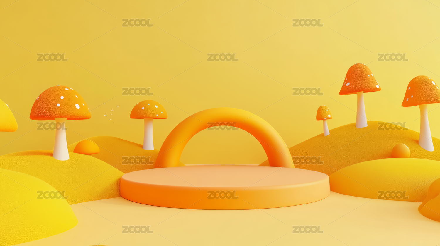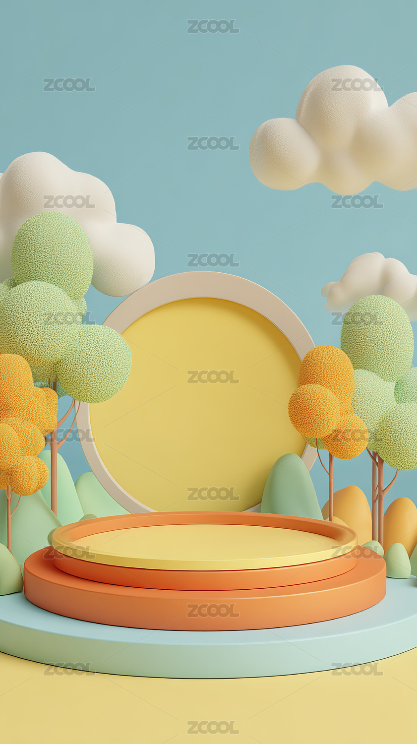 卡通,风景,展示台,树木,云朵,太阳,黄色,简洁,3D