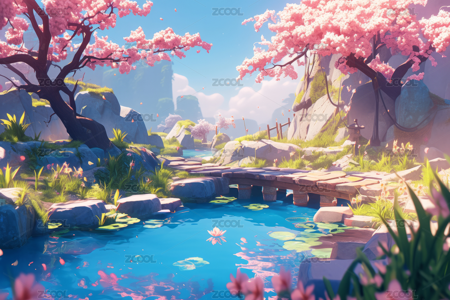 暖色春天鲜花盛开山间小溪3D卡通立体插画