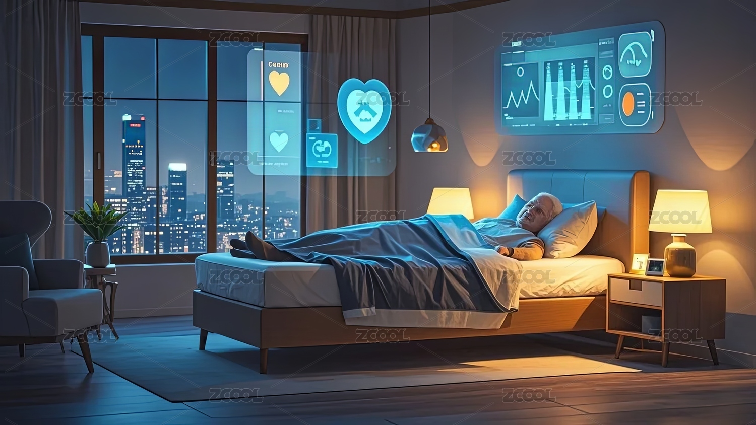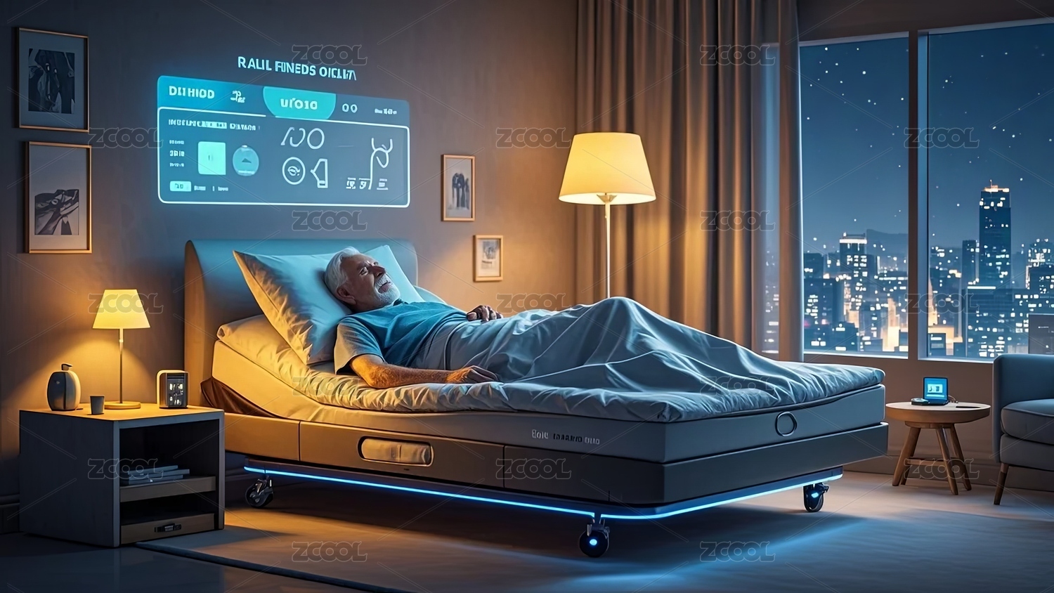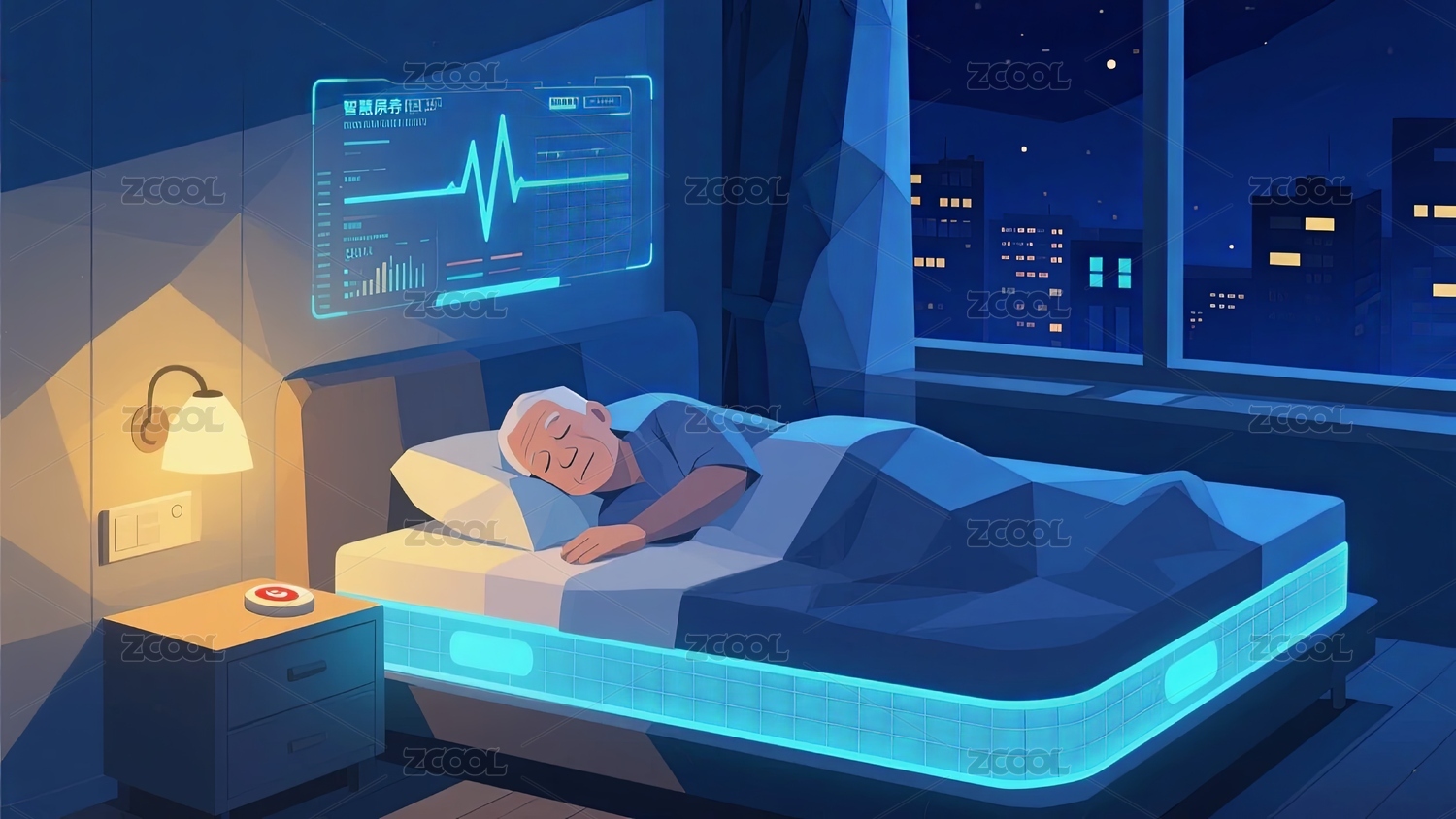 智能床,老人,卧室,夜景,床头屏,台灯,城市景观,床具,睡眠辅助,床