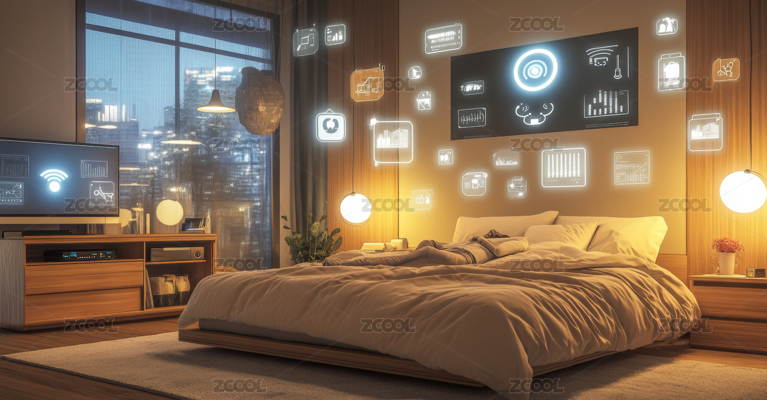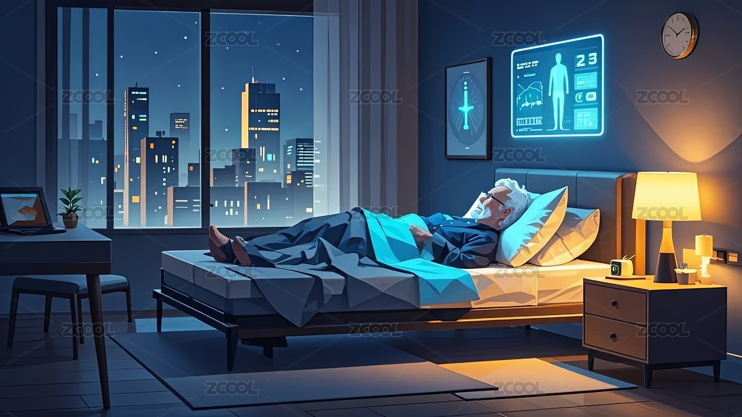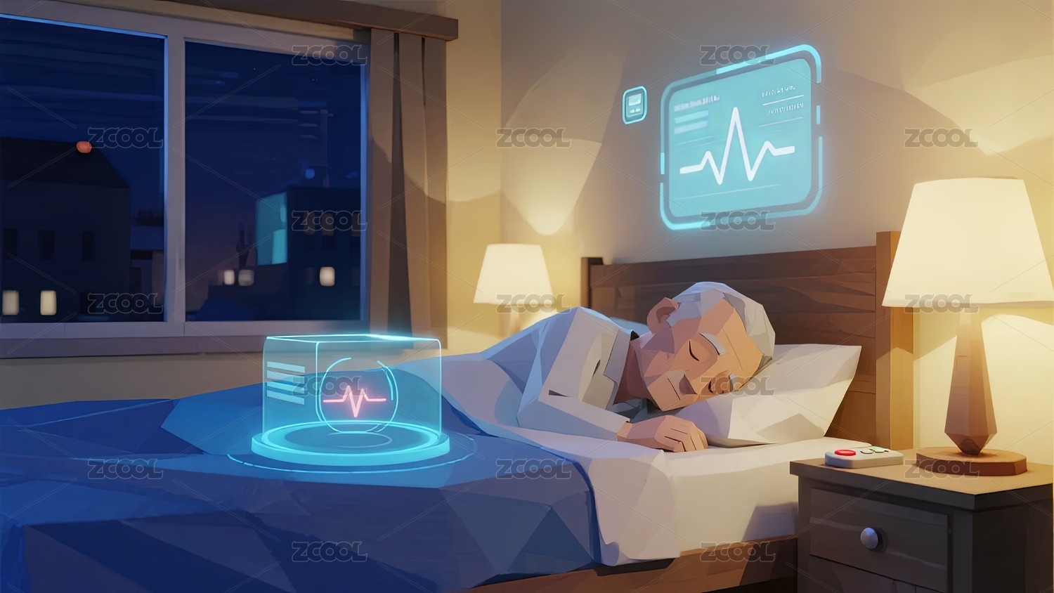 智能床,老人,卧室,夜景,床头屏,台灯,城市景观,床具,睡眠辅助,床