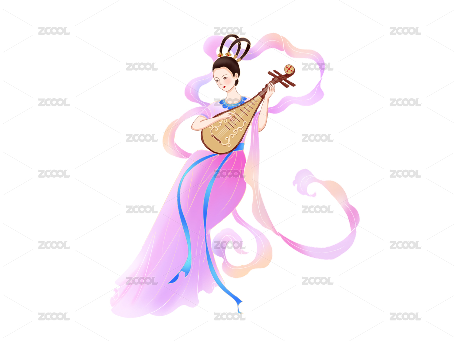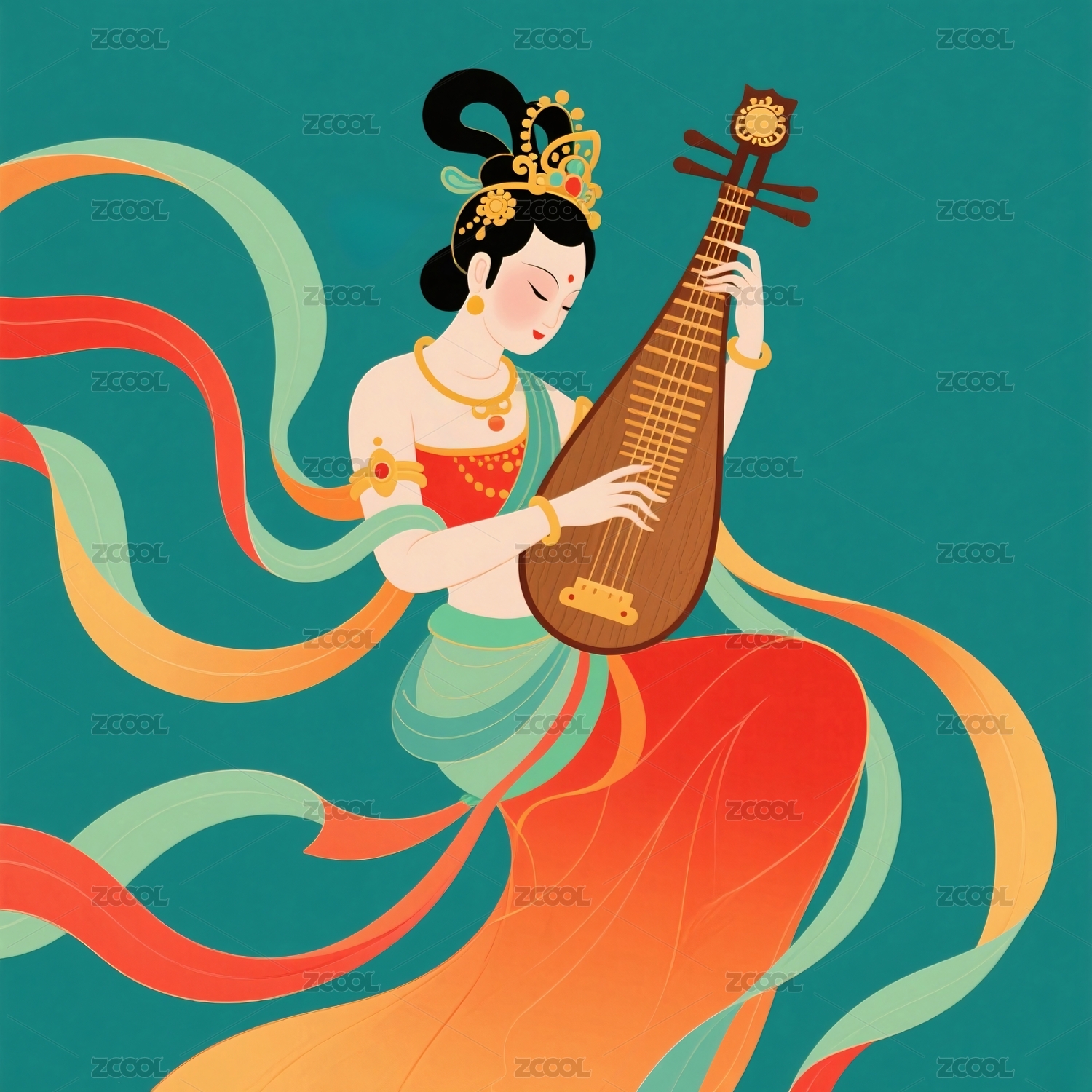 扁平风唐朝仕女优雅弹奏琵琶运营插画图