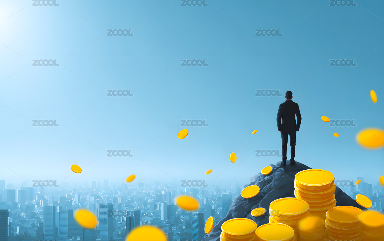 一个卡通男人站在金币组成的小山上