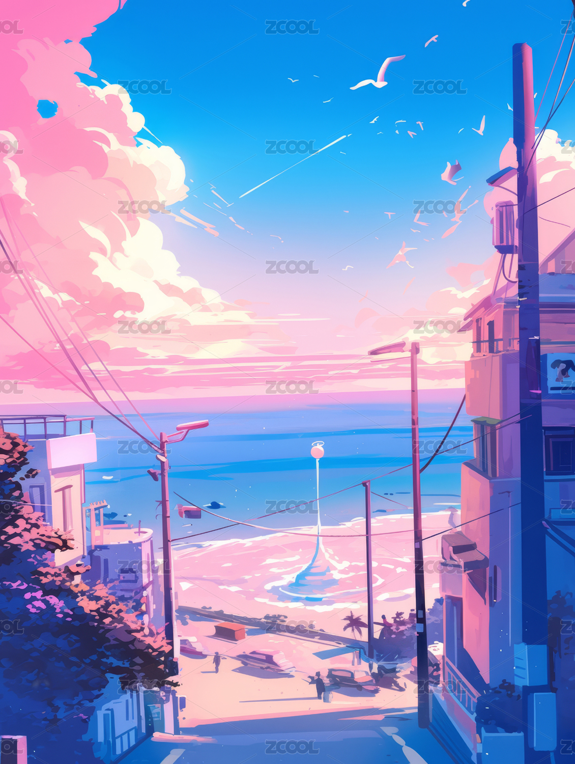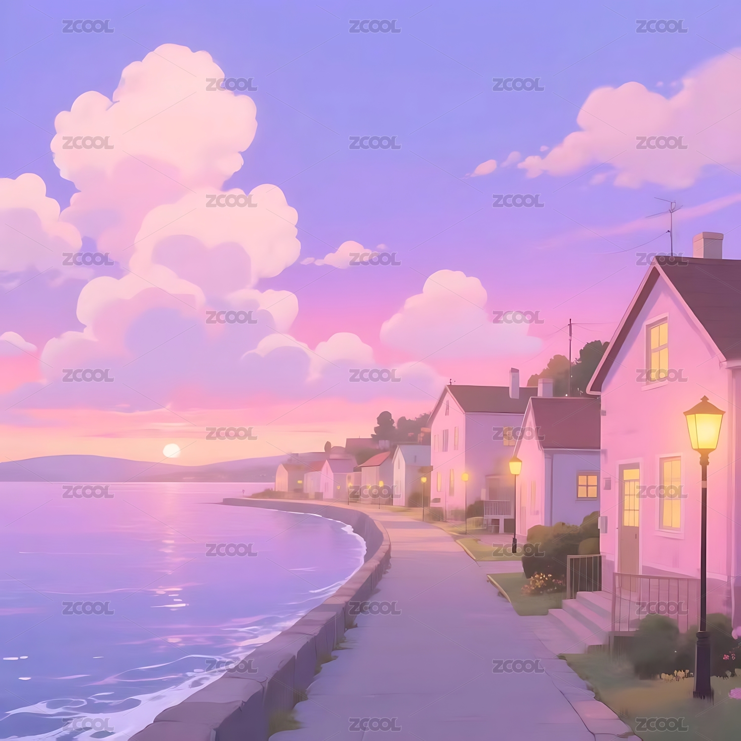 海滨,小镇,粉屋,橙灯,晚照,云影,水湾,夕霞,柔光,静岸
