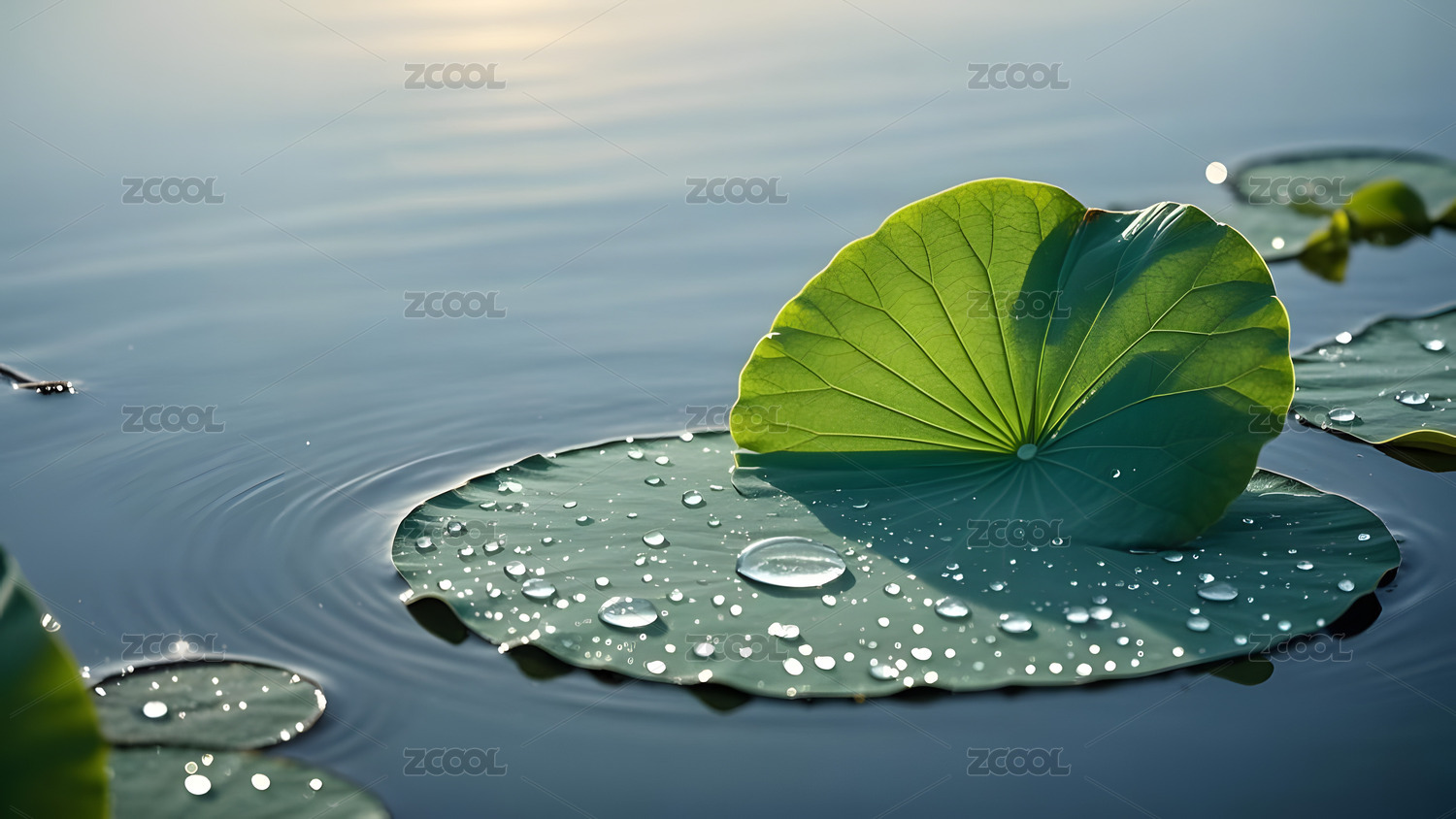 荷叶上的水珠与水面波纹