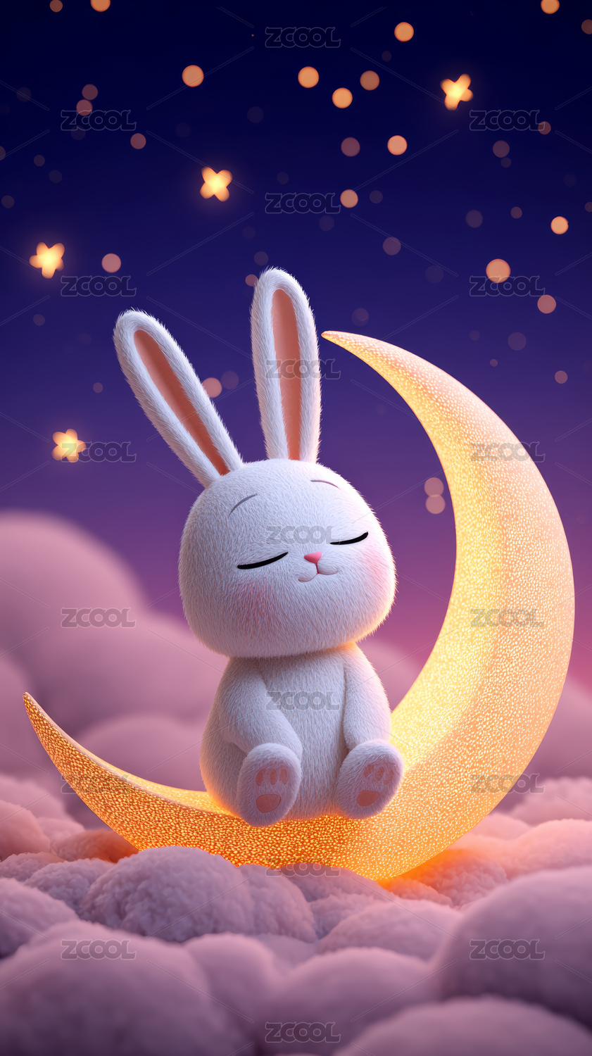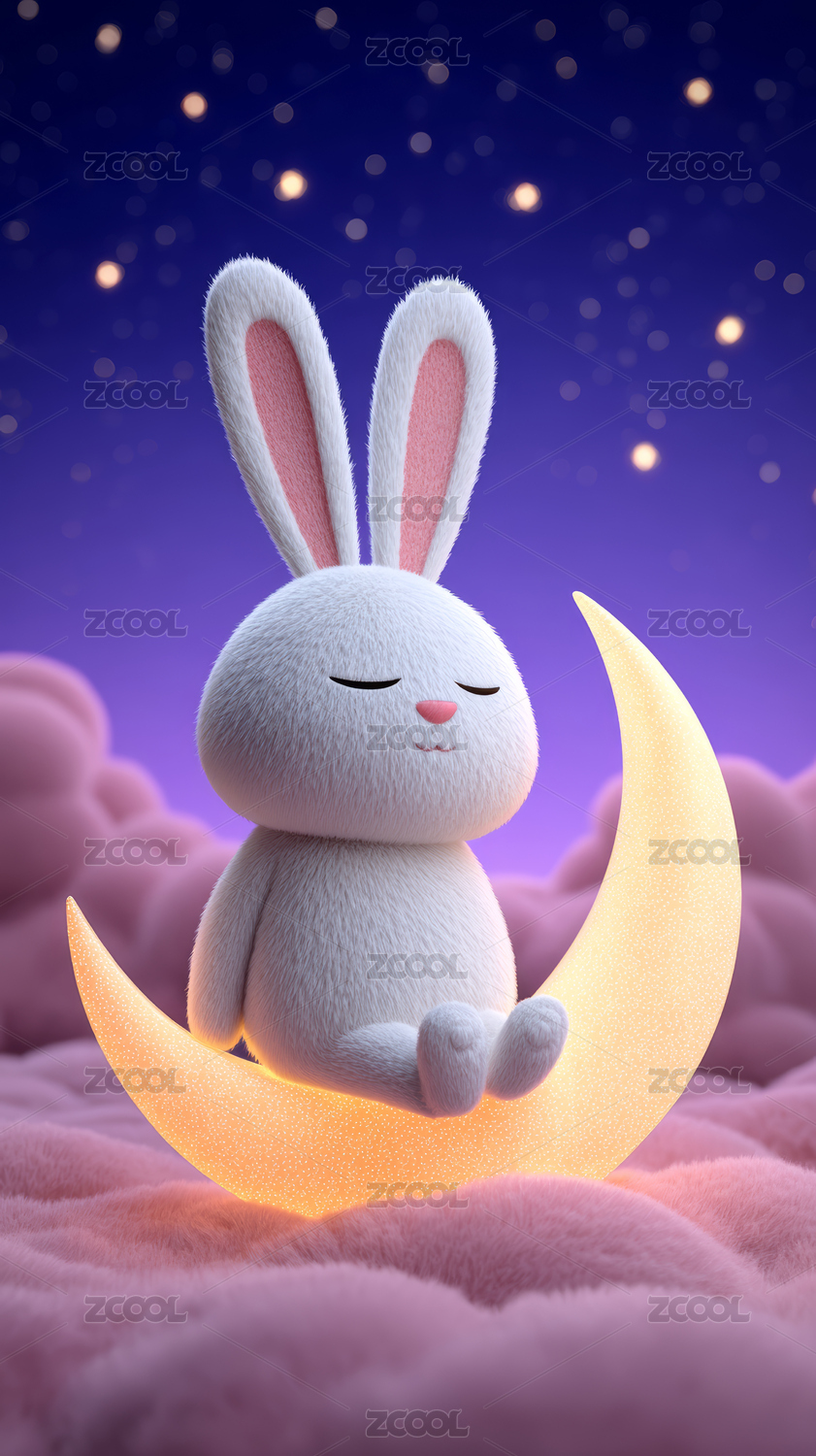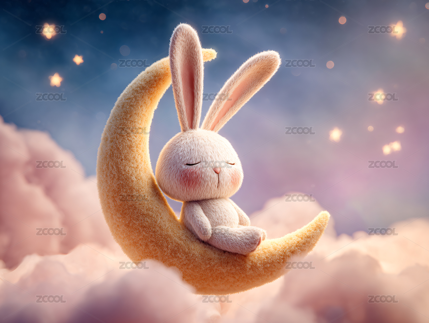 白兔睡在弯月云朵上