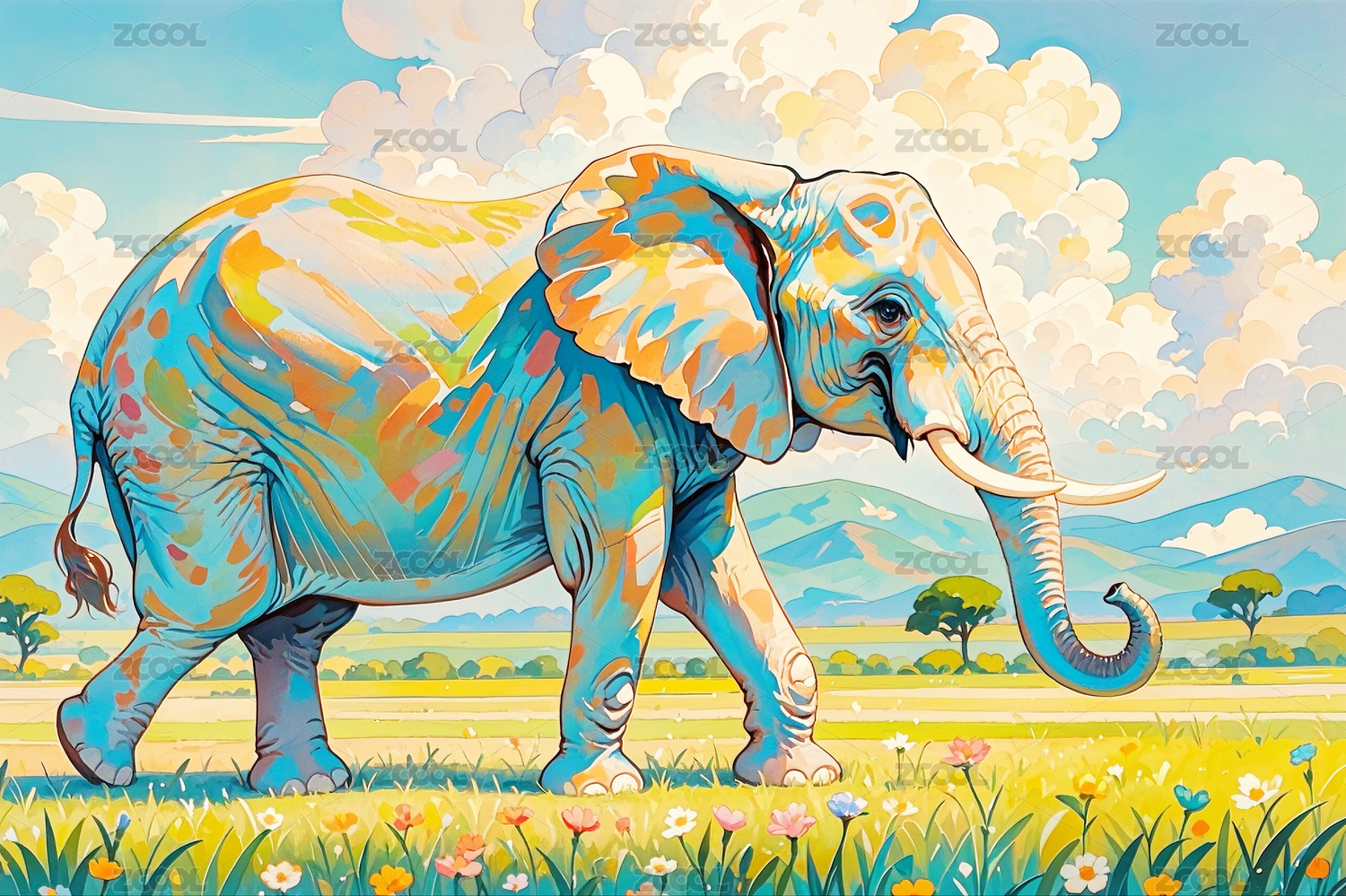 非洲草原大象风景动物油画世界油画风景油画印象派油画