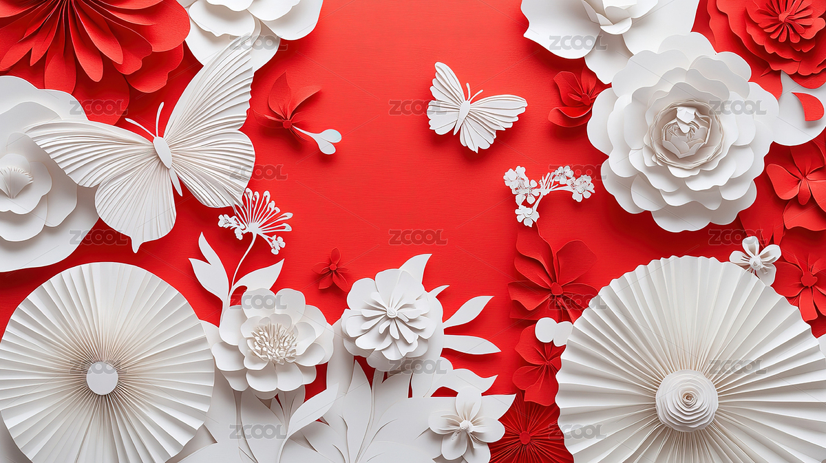 红色背景上的白色纸花装饰