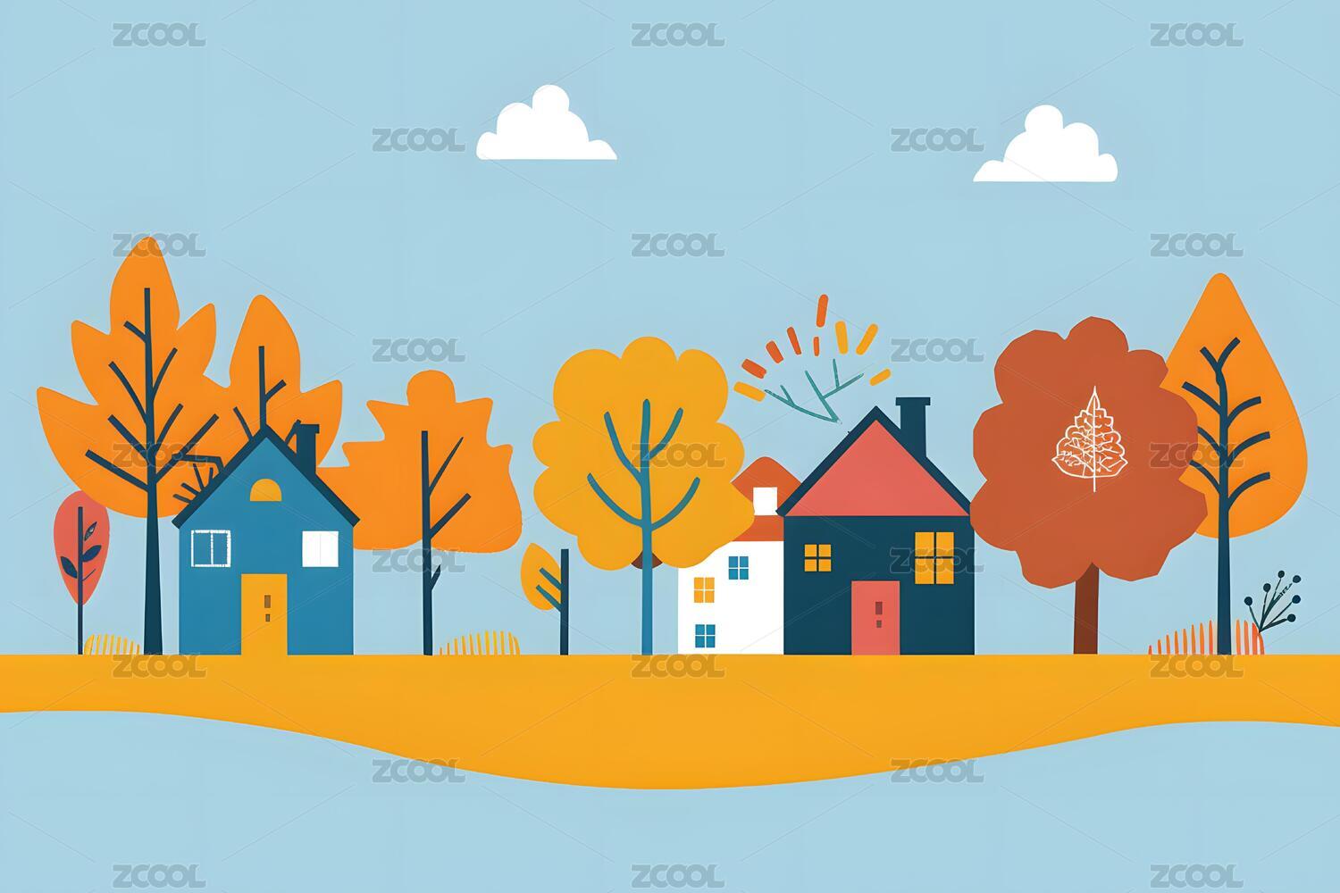 秋天的房屋和树木景观