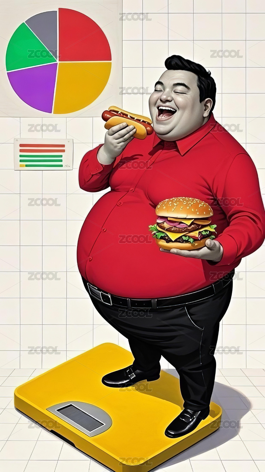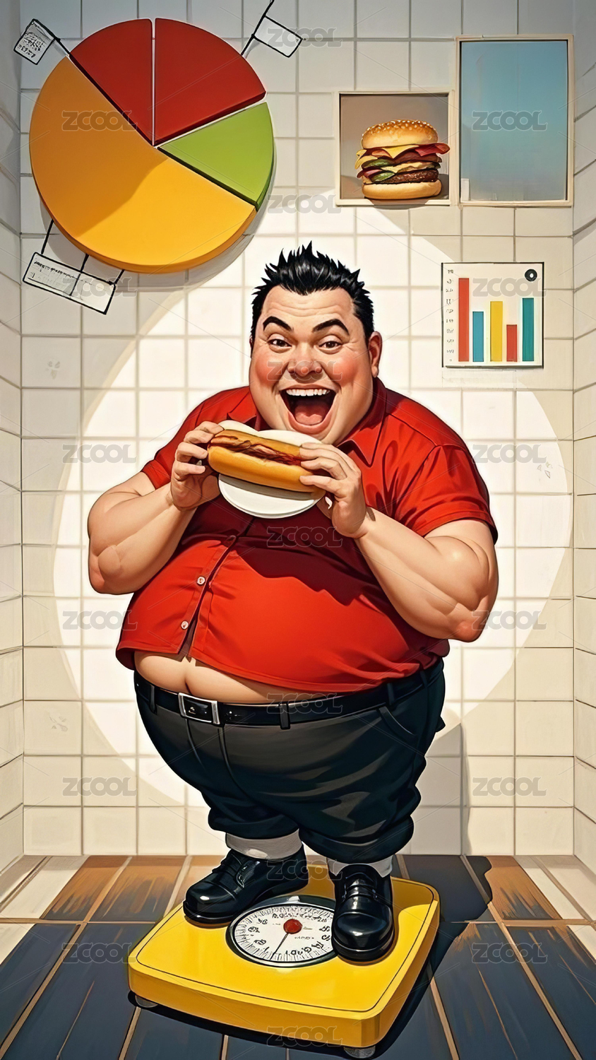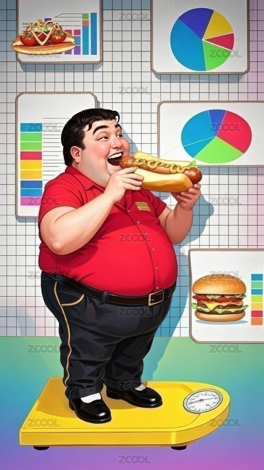一个手拿着烤肠大笑短发肥胖的女孩插画