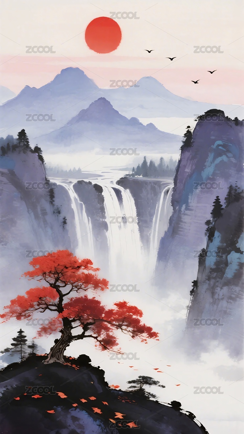国风,水墨,山水,瀑布,意境,仙境,山河,磅礴,大气,壮丽