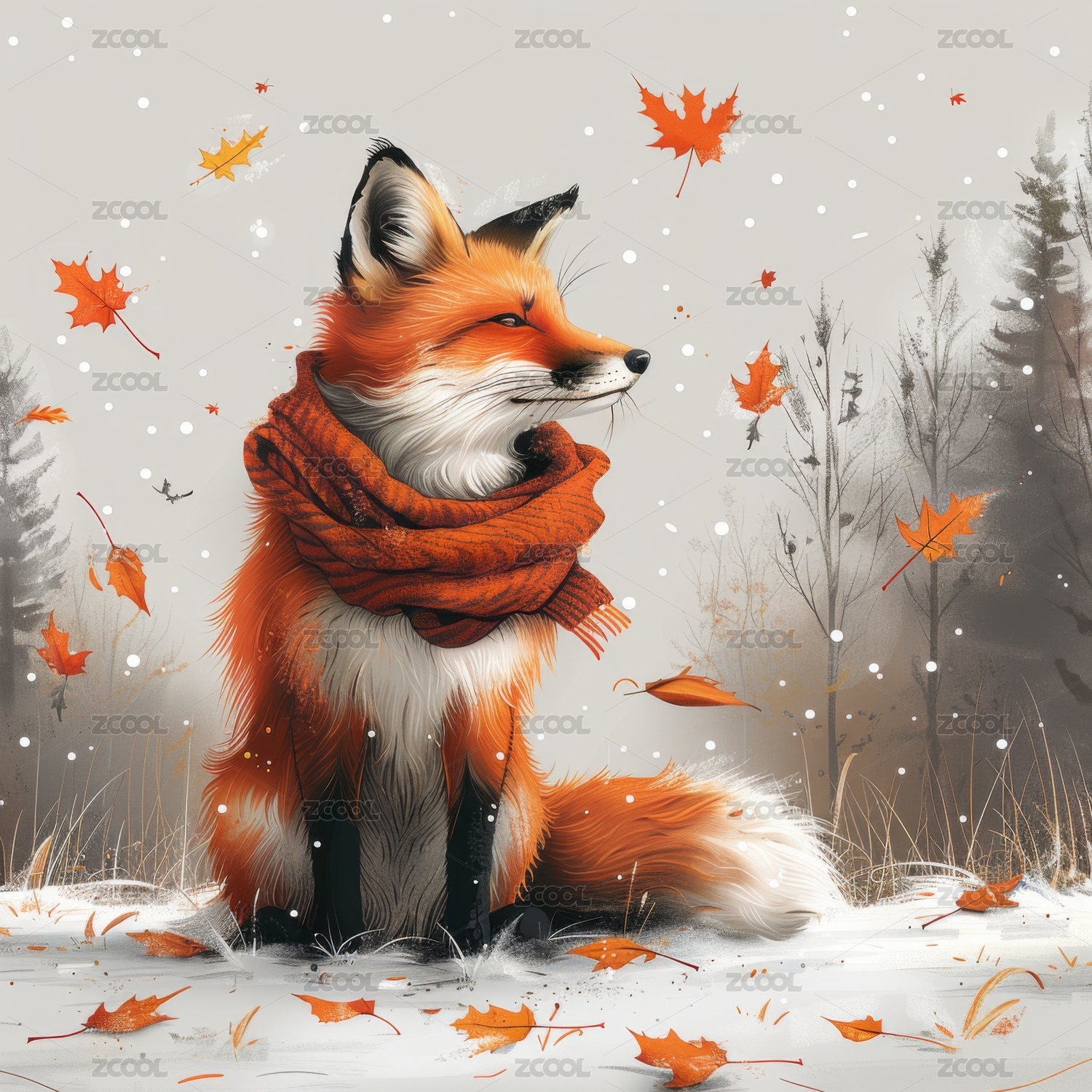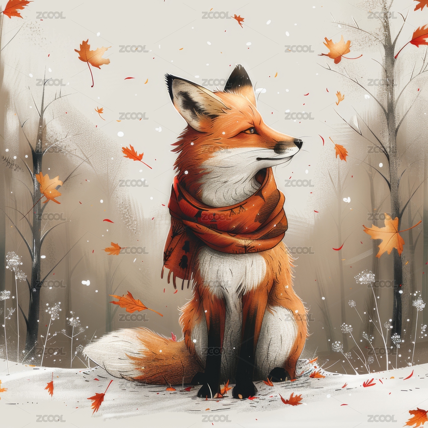 戴着围巾的狐狸坐在雪地里的插画