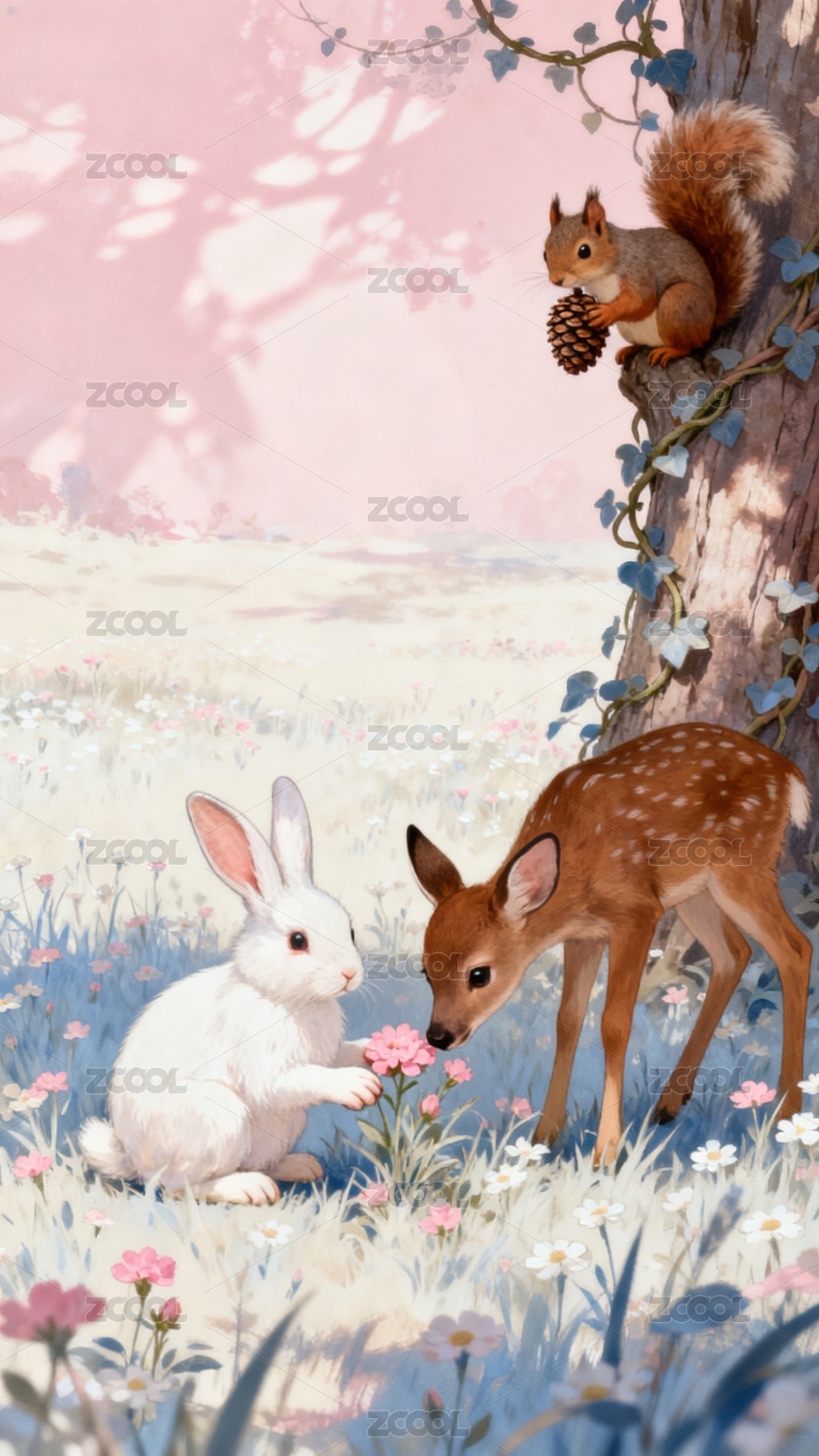森林中小鹿和白兔