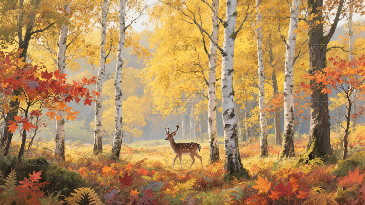 秋天白桦林中的小鹿艺术背景