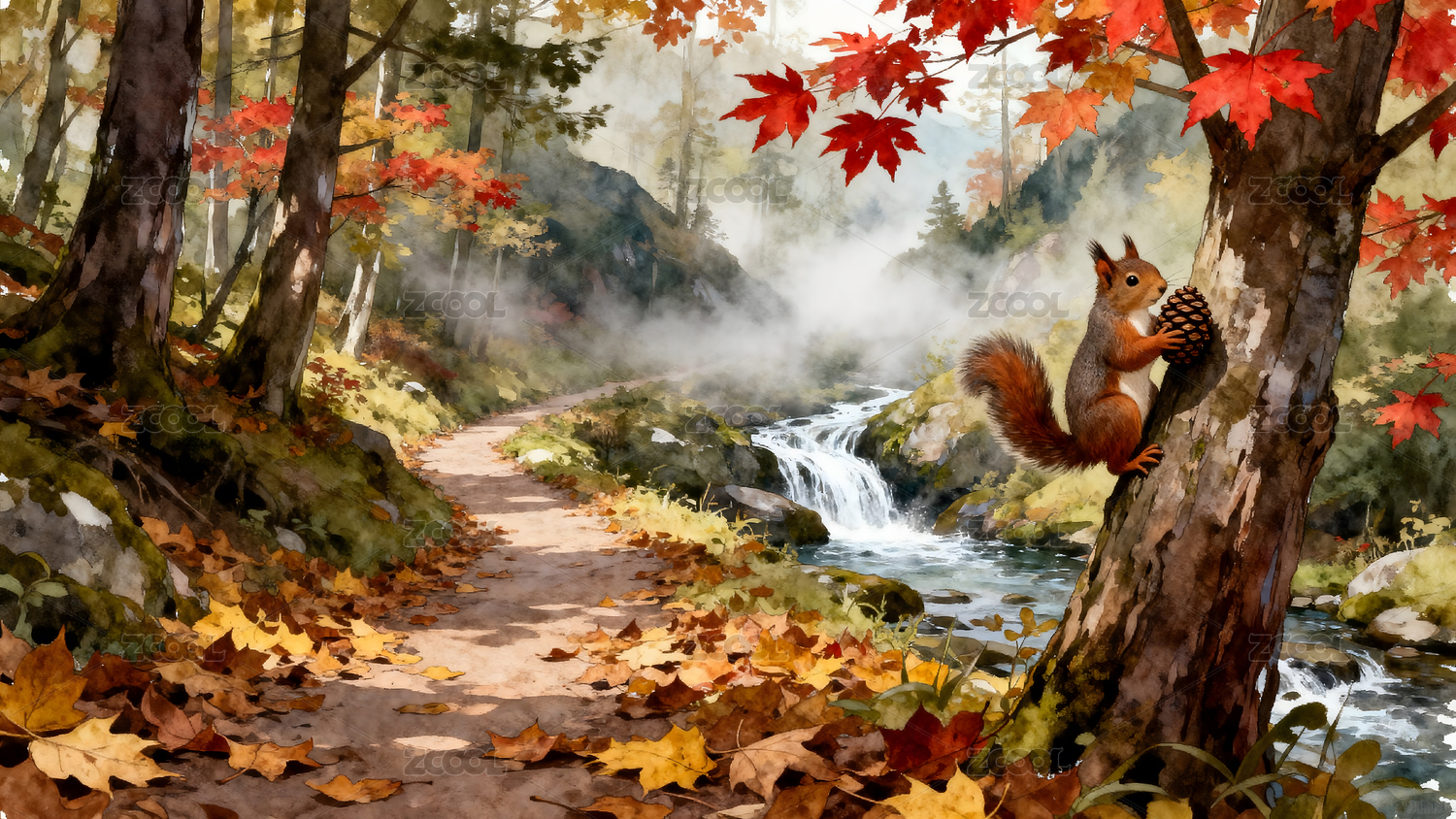 红枫落叶下的小松鼠