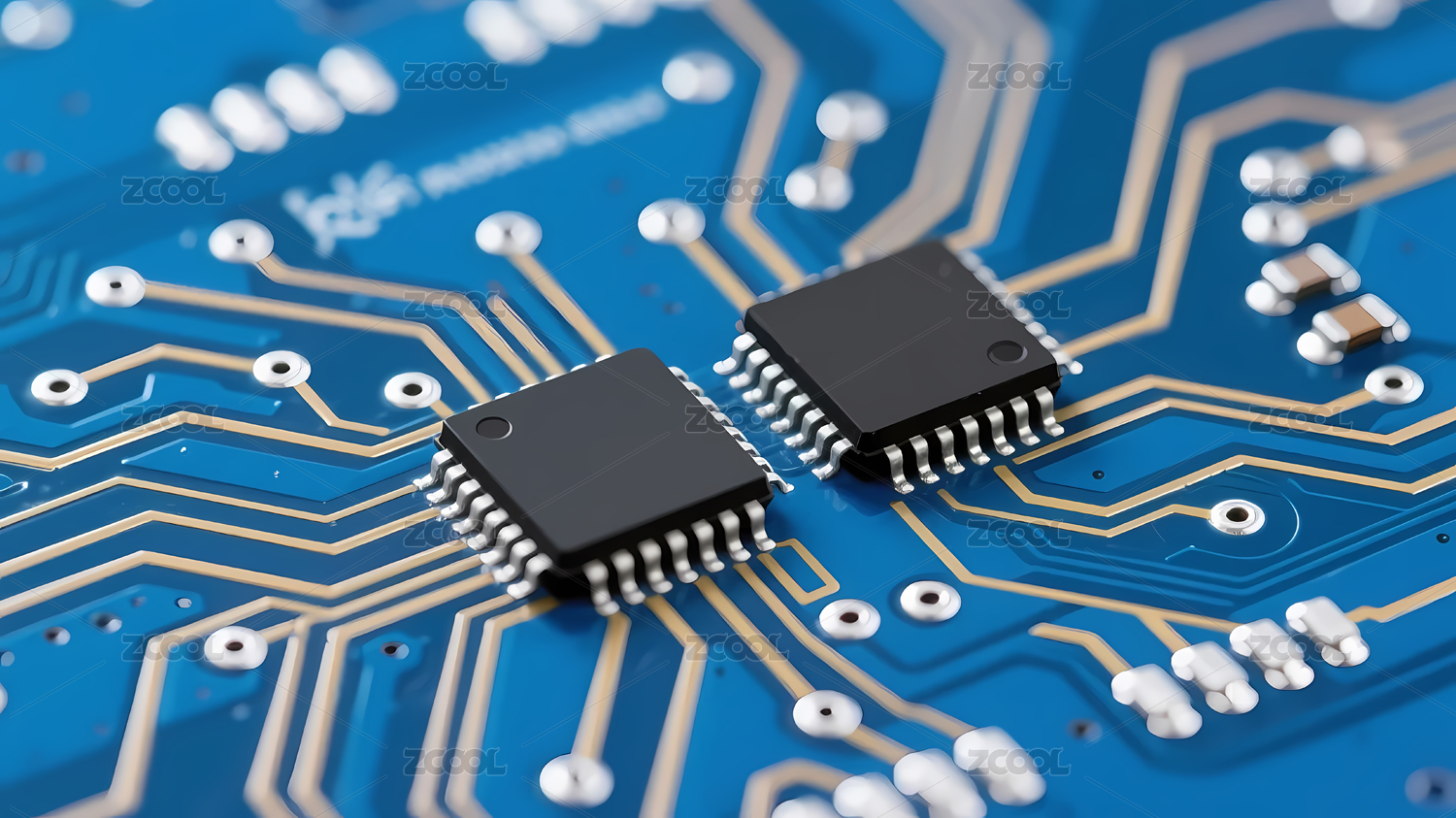 蓝色电路板上的芯片与焊点