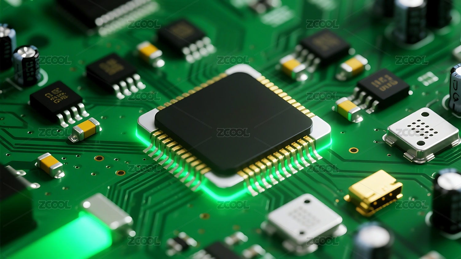 绿色电路板上的芯片特写