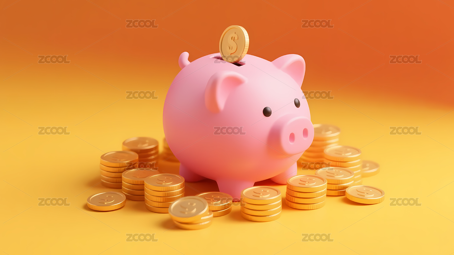 金币环绕的粉色储蓄罐