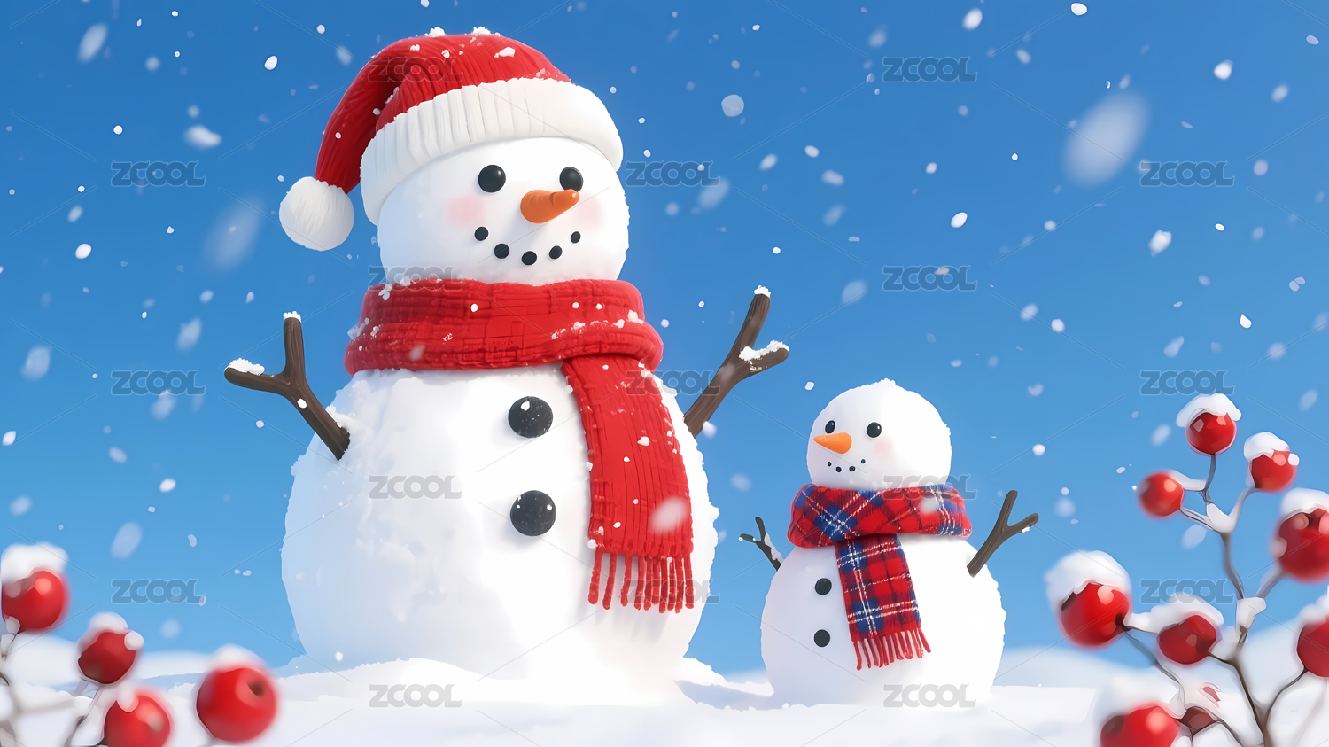 雪人蓝天雪花红果