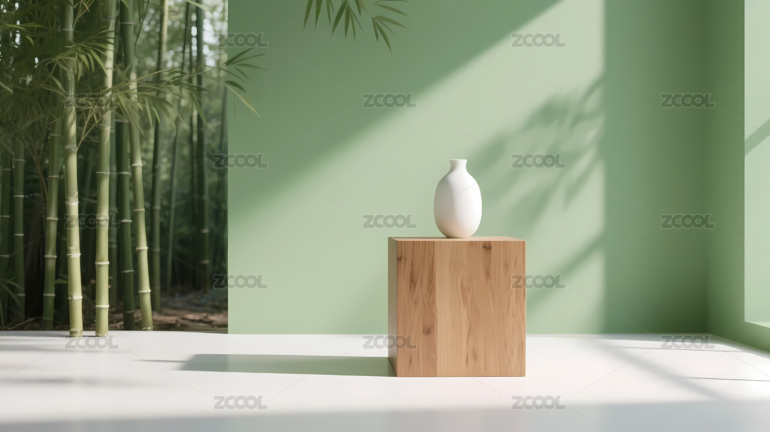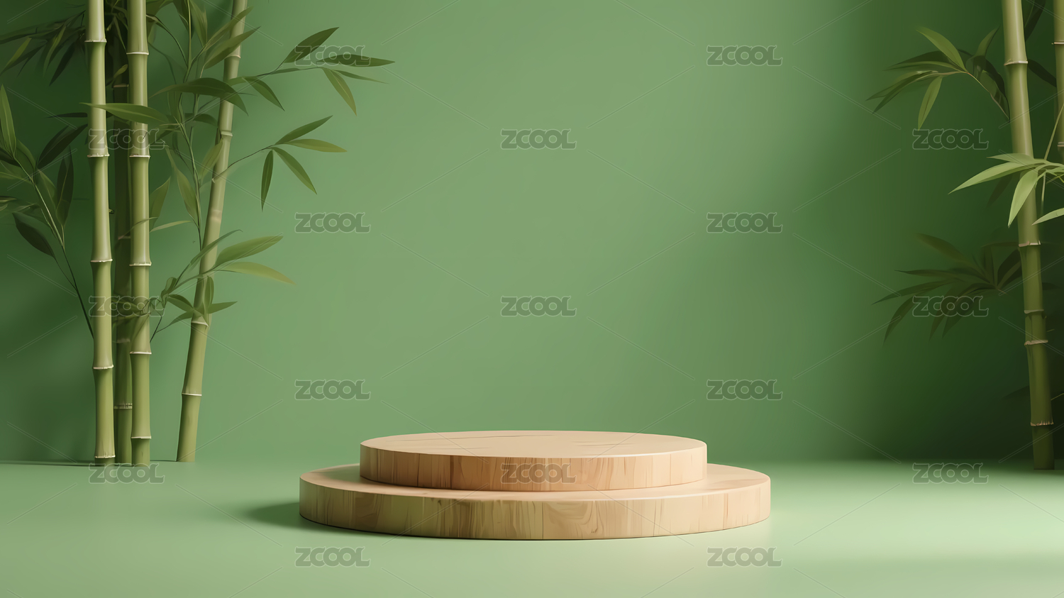 木质圆台与绿色竹子
