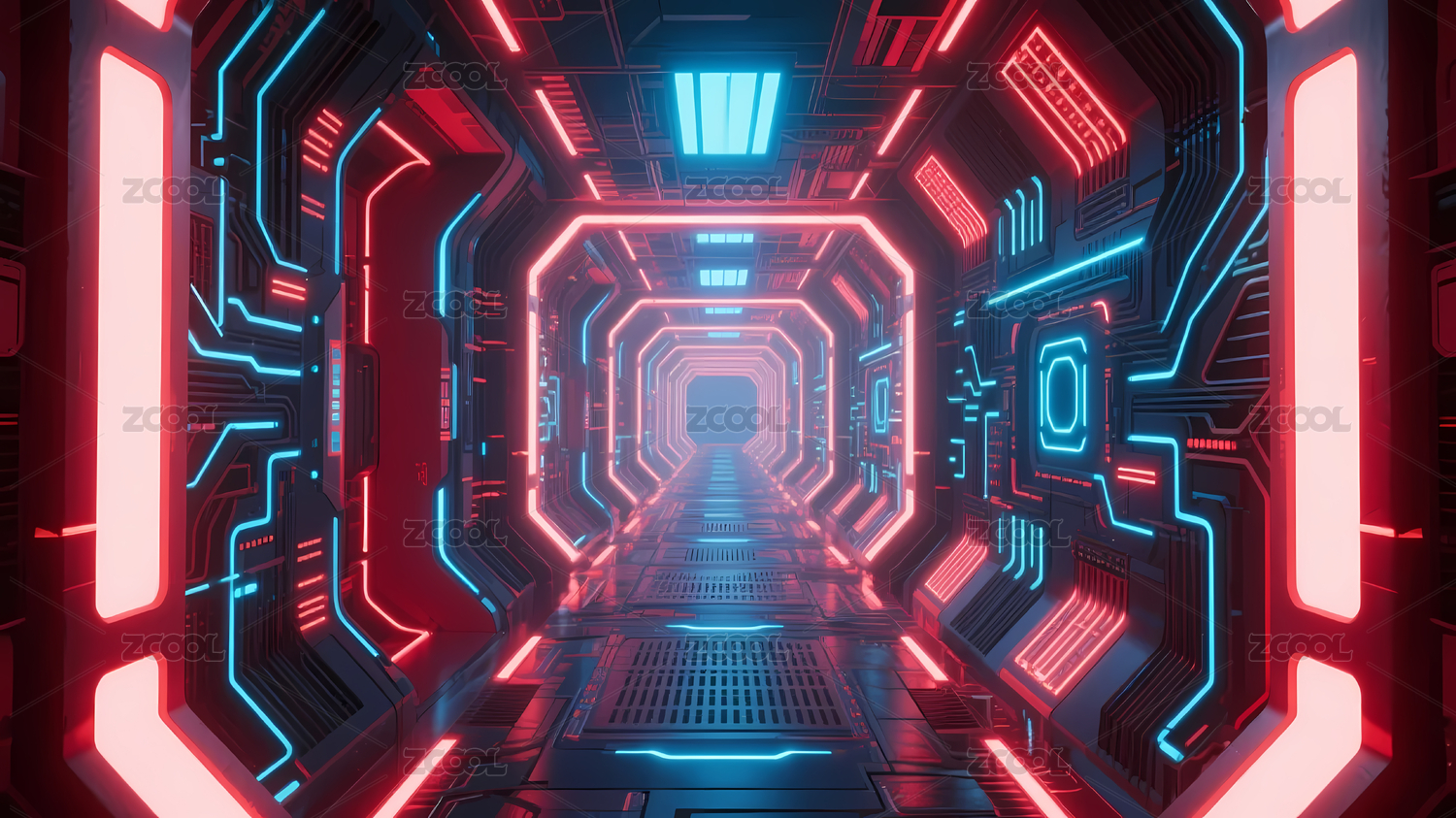 走廊,霓虹灯,红色,蓝色,装饰,背景,深色,墙壁,地板,高科技