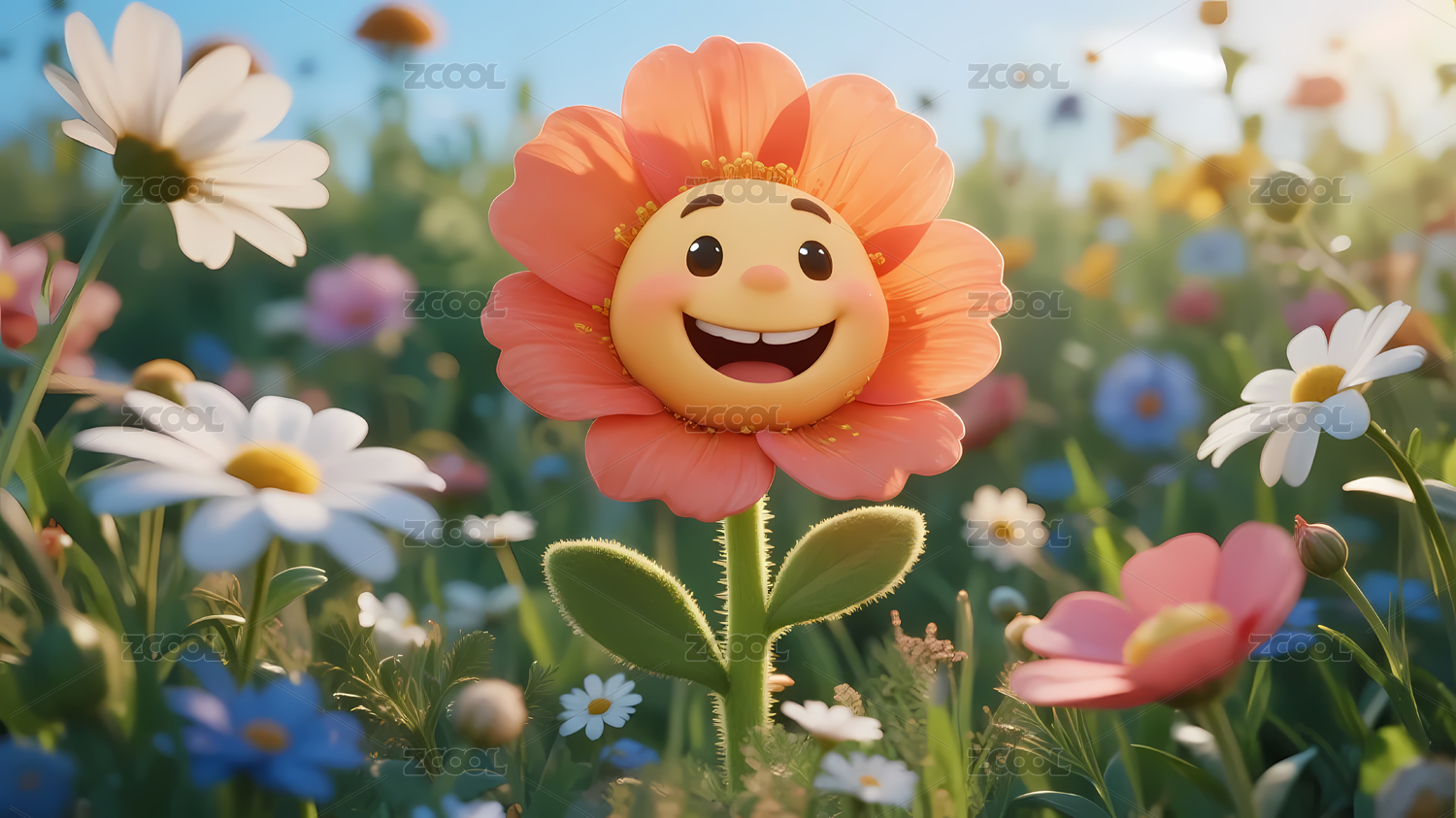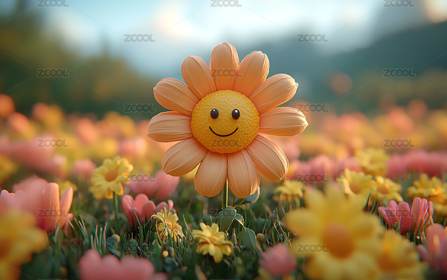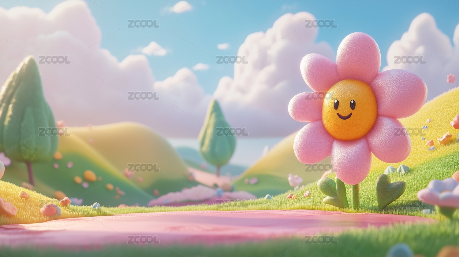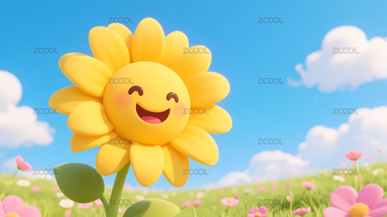 粉色,绿色,花朵,笑脸,蓝天,明亮,草地,白云,其他