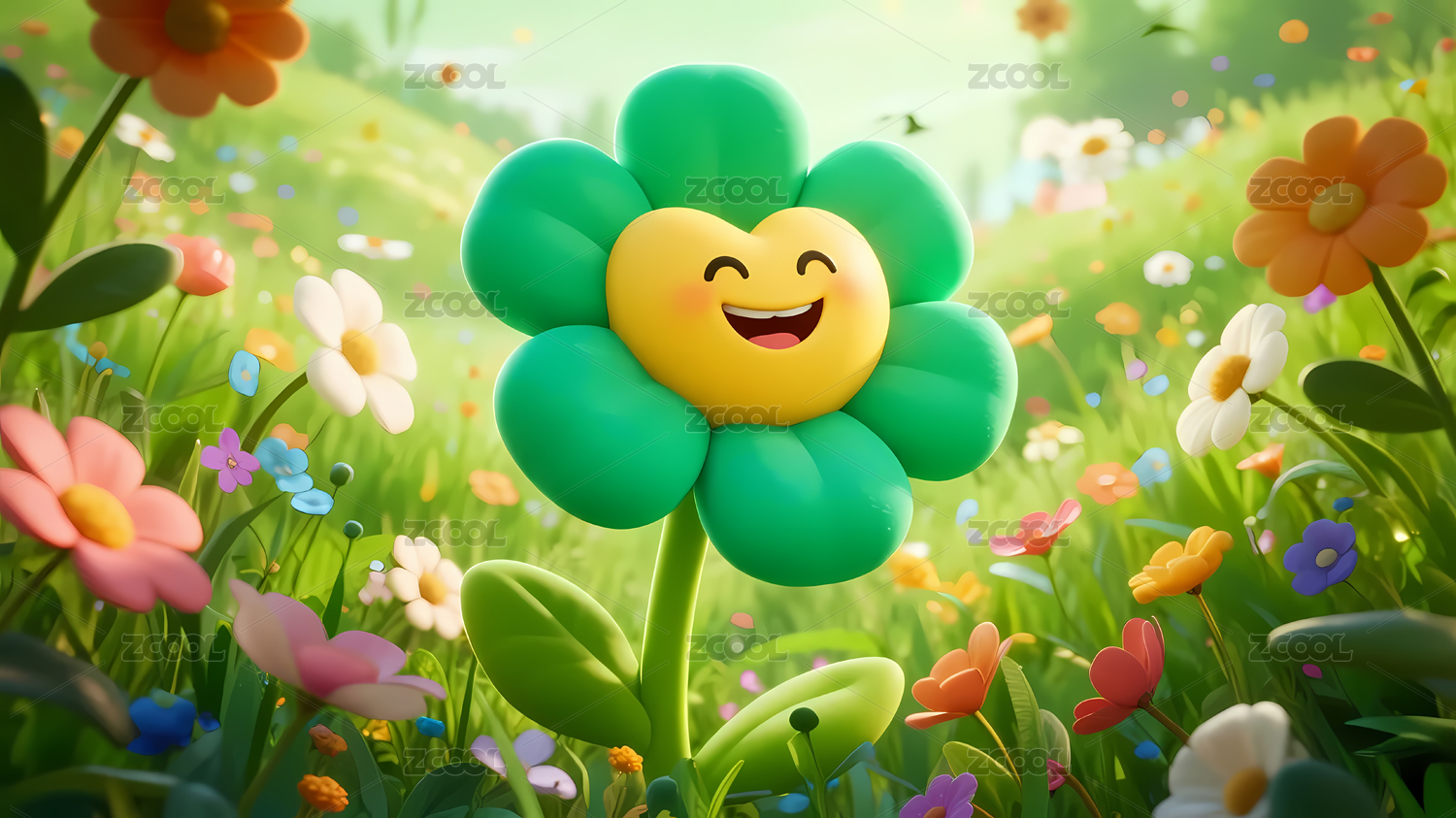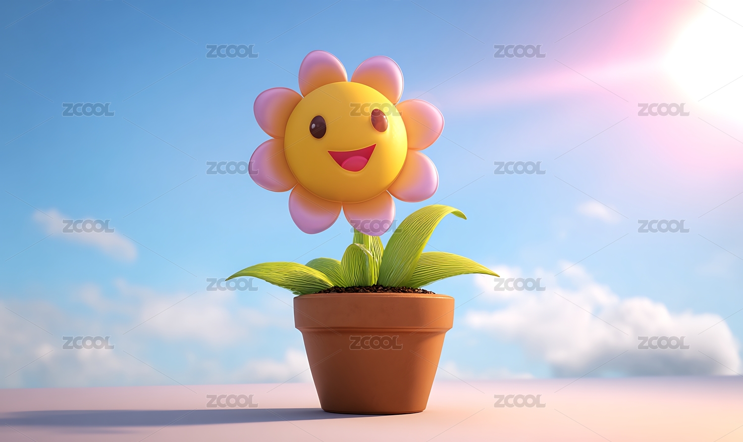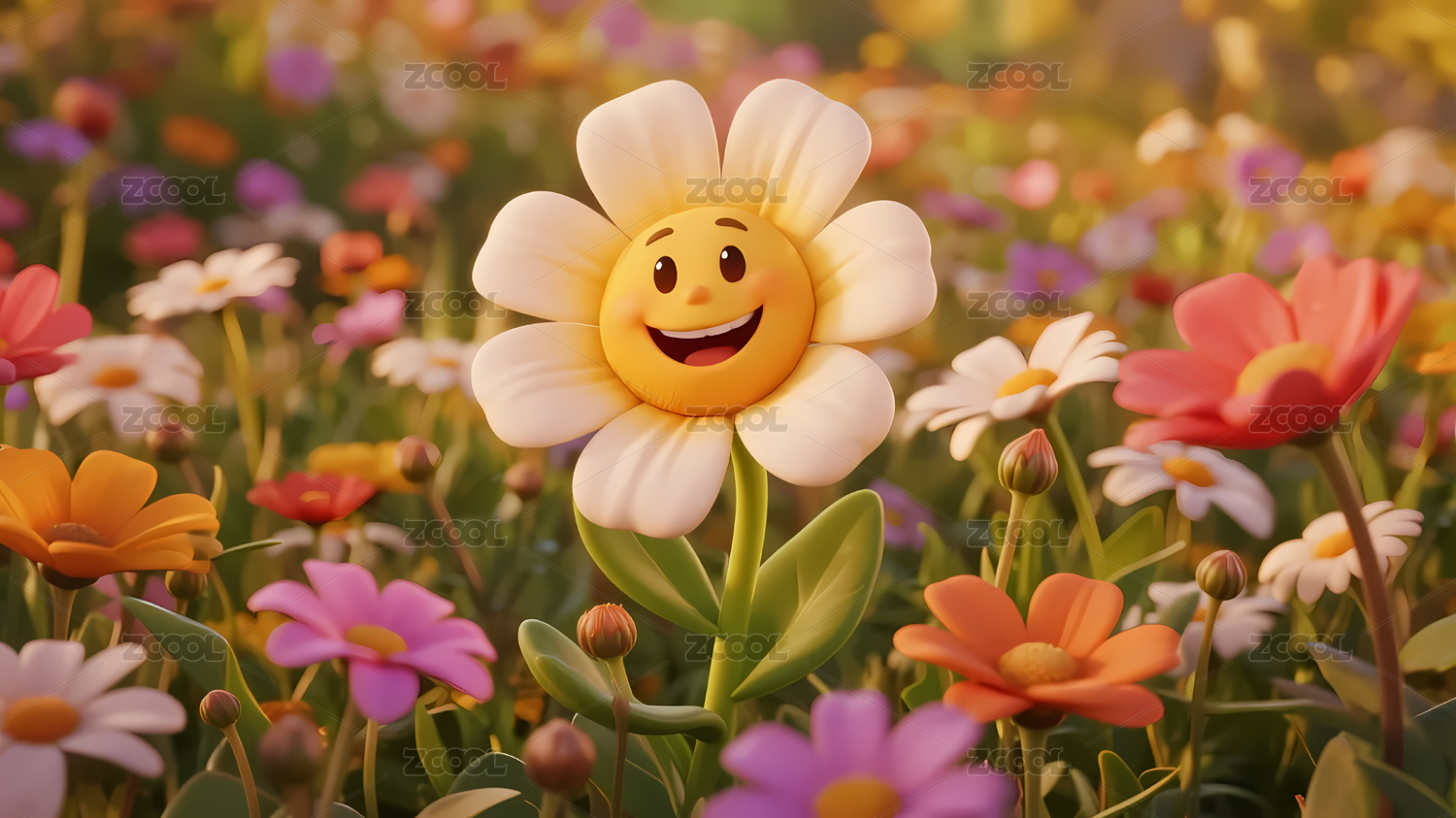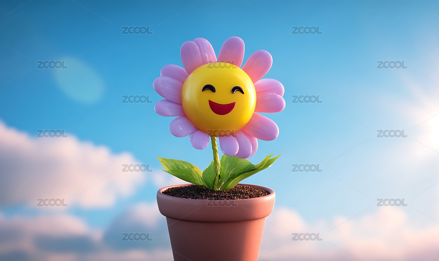 粉色,绿色,花朵,笑脸,蓝天,明亮,草地,白云,其他