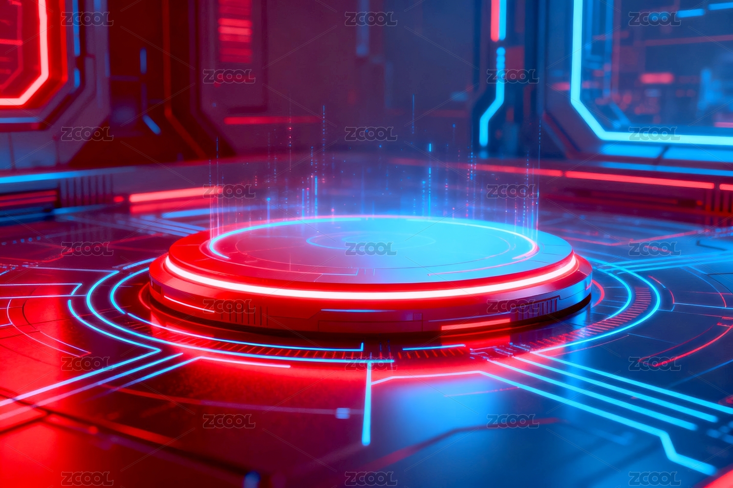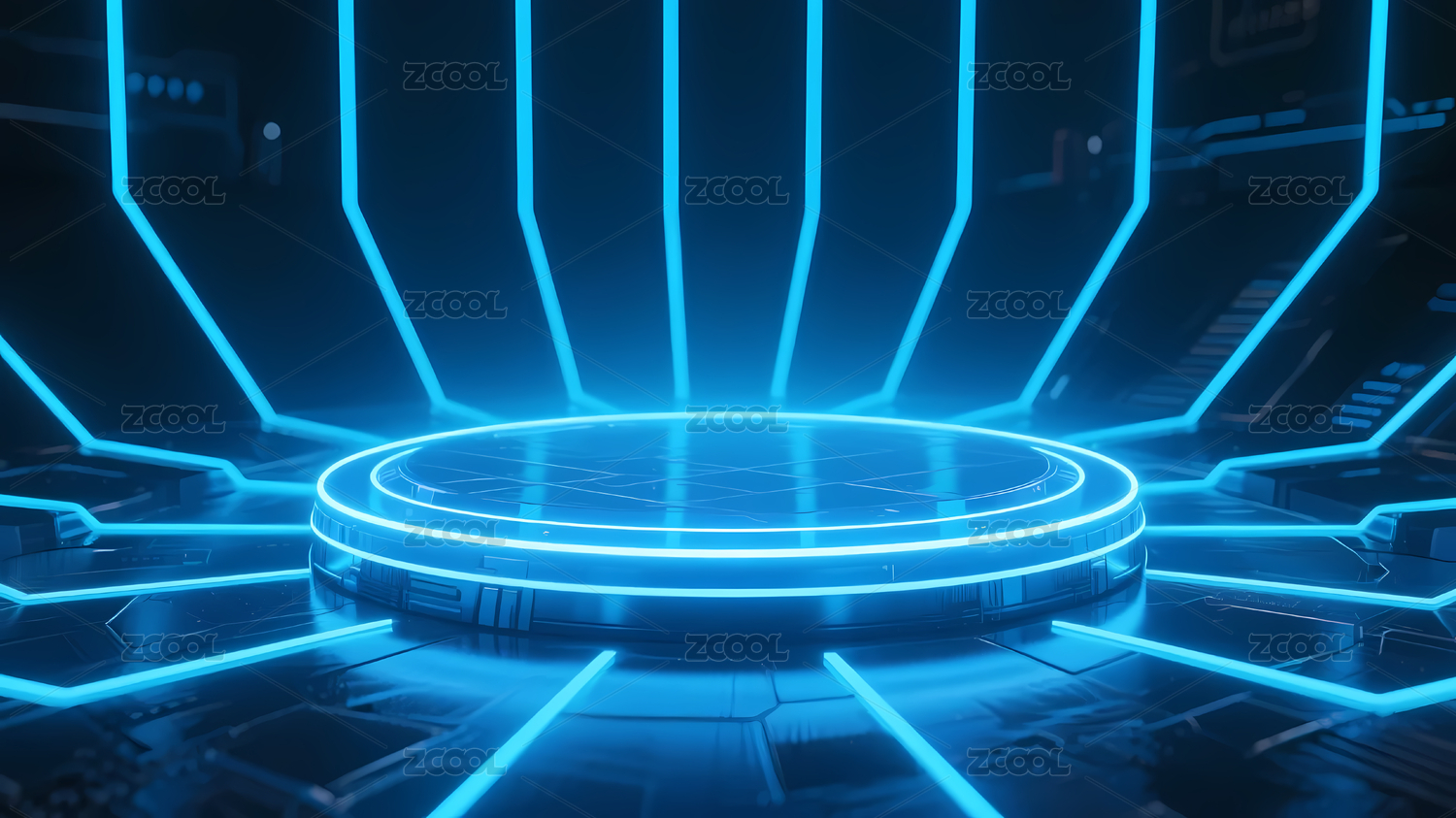 三维渲染蓝紫色霓虹灯拱门室内空间