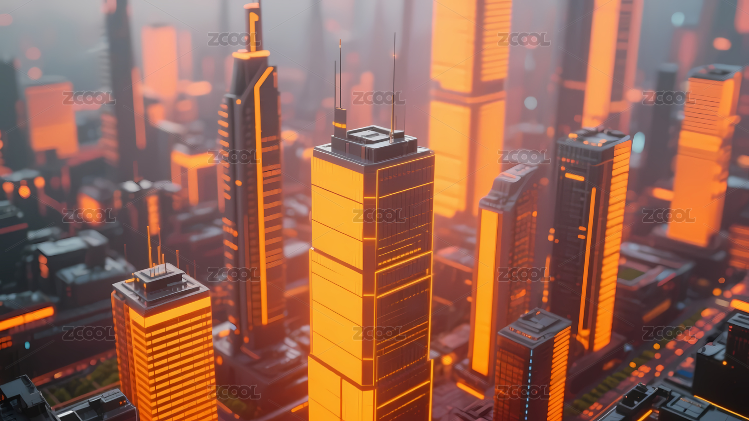 橙色,深蓝,高楼,燃烧,城市,黄色,模型,树木,大厦,街道