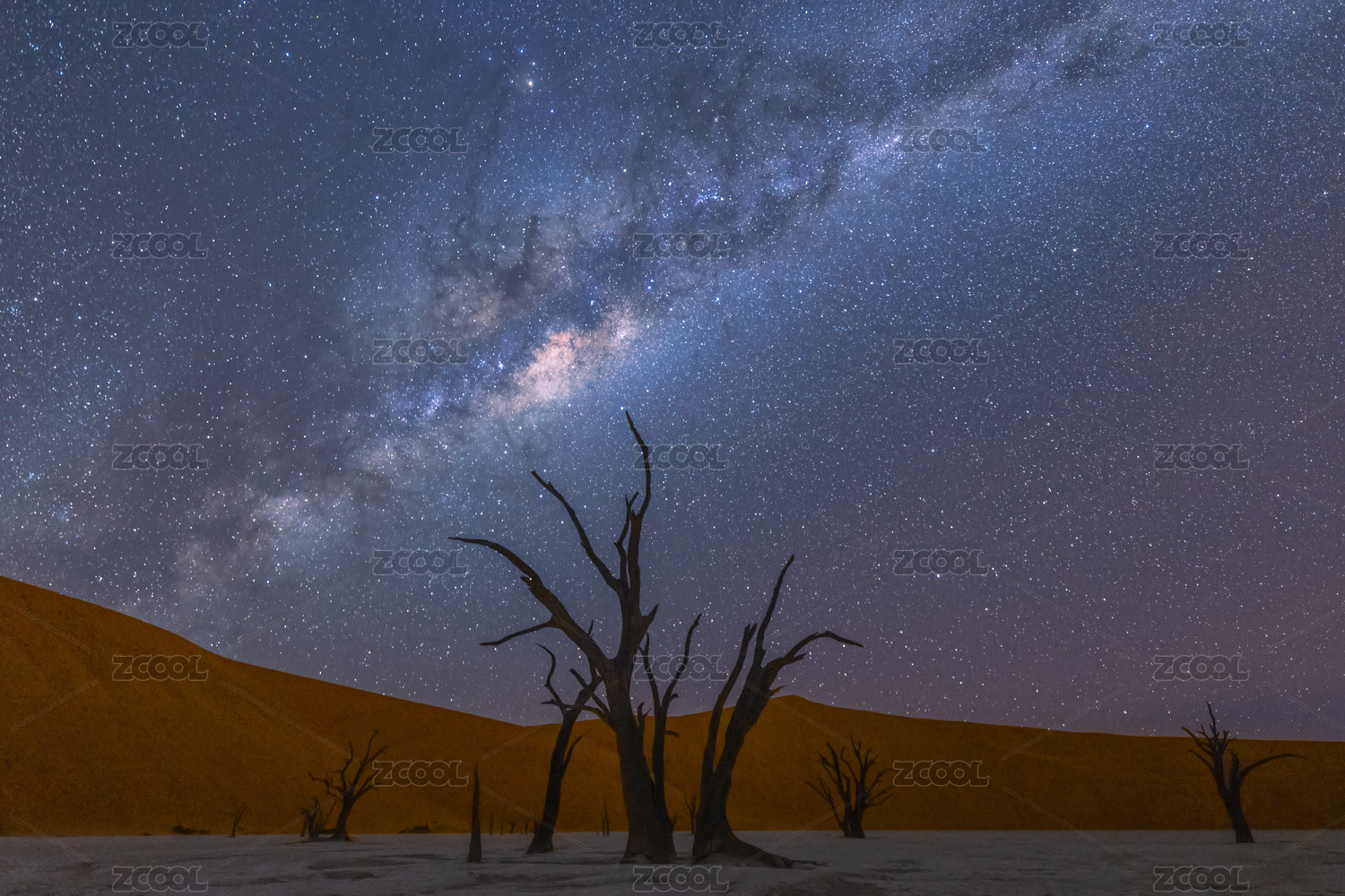 荒漠中一棵枯树的上空横贯着一片绚丽的星云