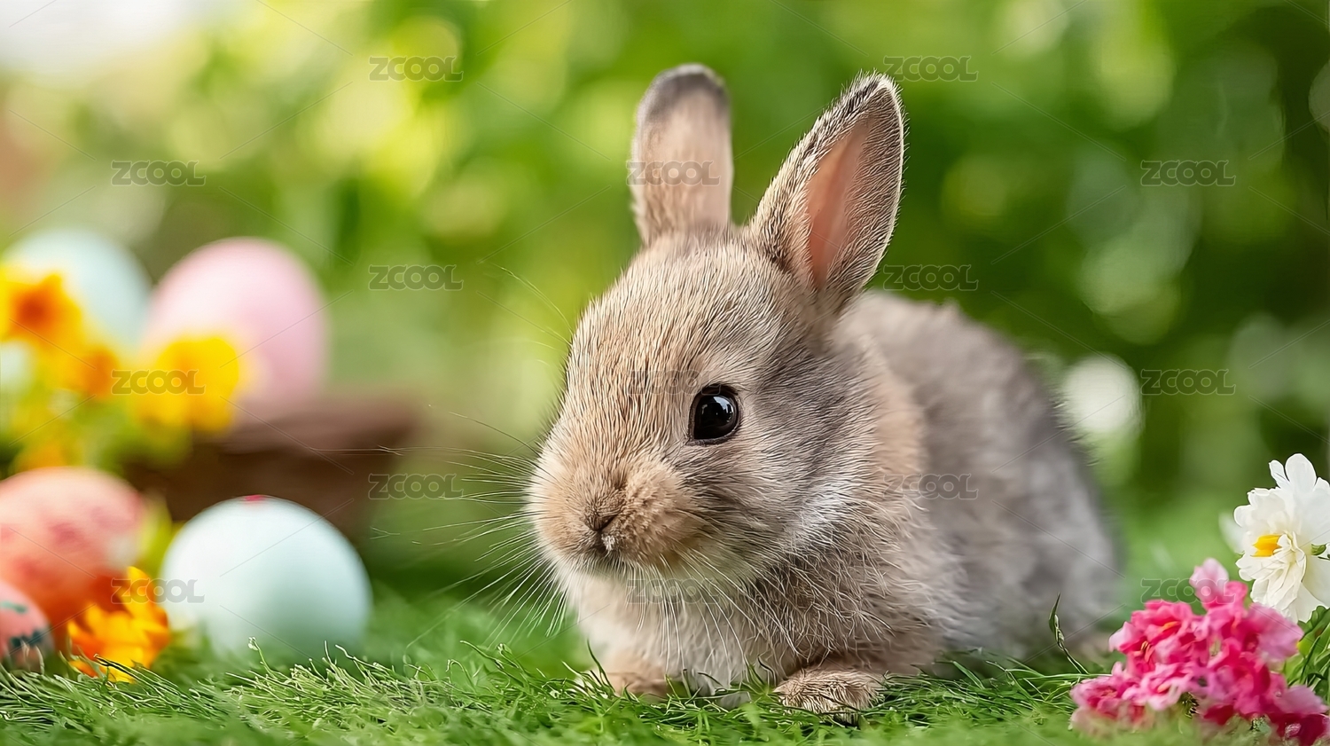 一只小兔子趴在草地上周围有彩蛋和花朵