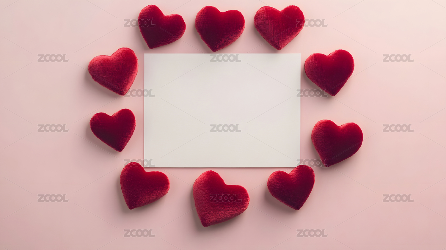 红色爱心围绕空白纸张粉色背景