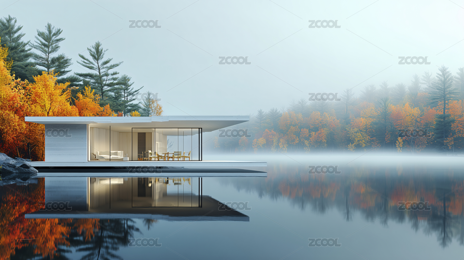 别墅,玻璃,墙壁,湖泊,山脉,松树,倒影,晨光,宁静,建筑
