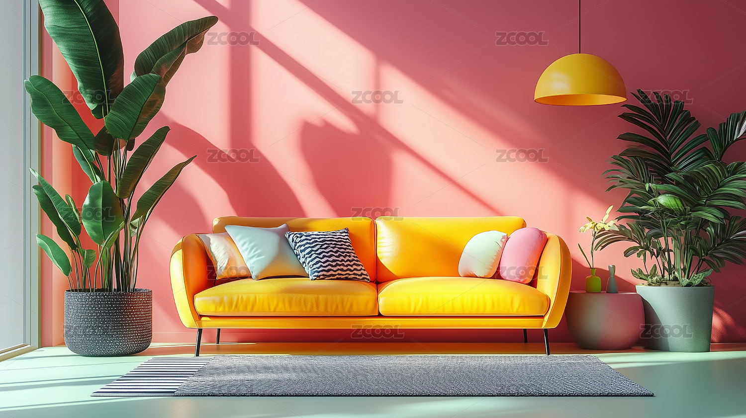 客厅,沙发,黄色,墙壁,珊瑚,植物,装饰,抽象,艺术,阴影