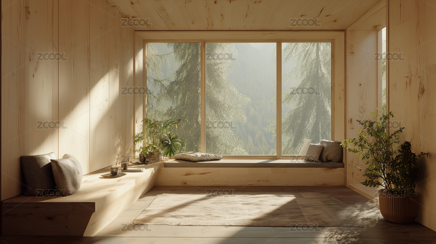 房间,日式,北欧,木材,面板,极简,窗户,森林,景观,阳光